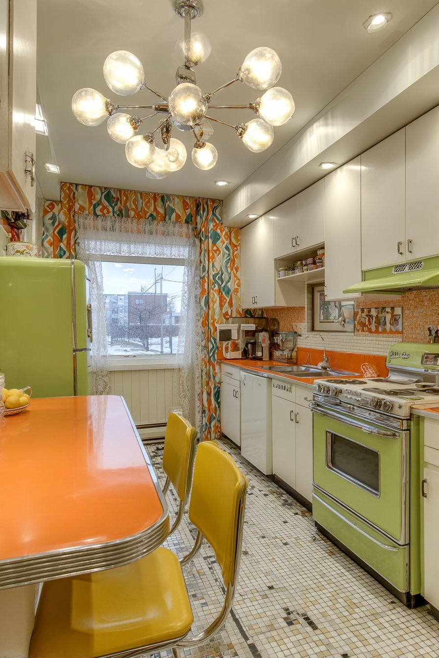 Picture a vibrant kitchen where bold geometric wallpaper commands attention. Orange and teal patterns dance across white walls. The breakfast nook features a chrome-legged Formica table. Sunny yellow vinyl chairs surround it, creating instant cheerfulness. An avocado green refrigerator stands proudly against white streamlined cabinets.