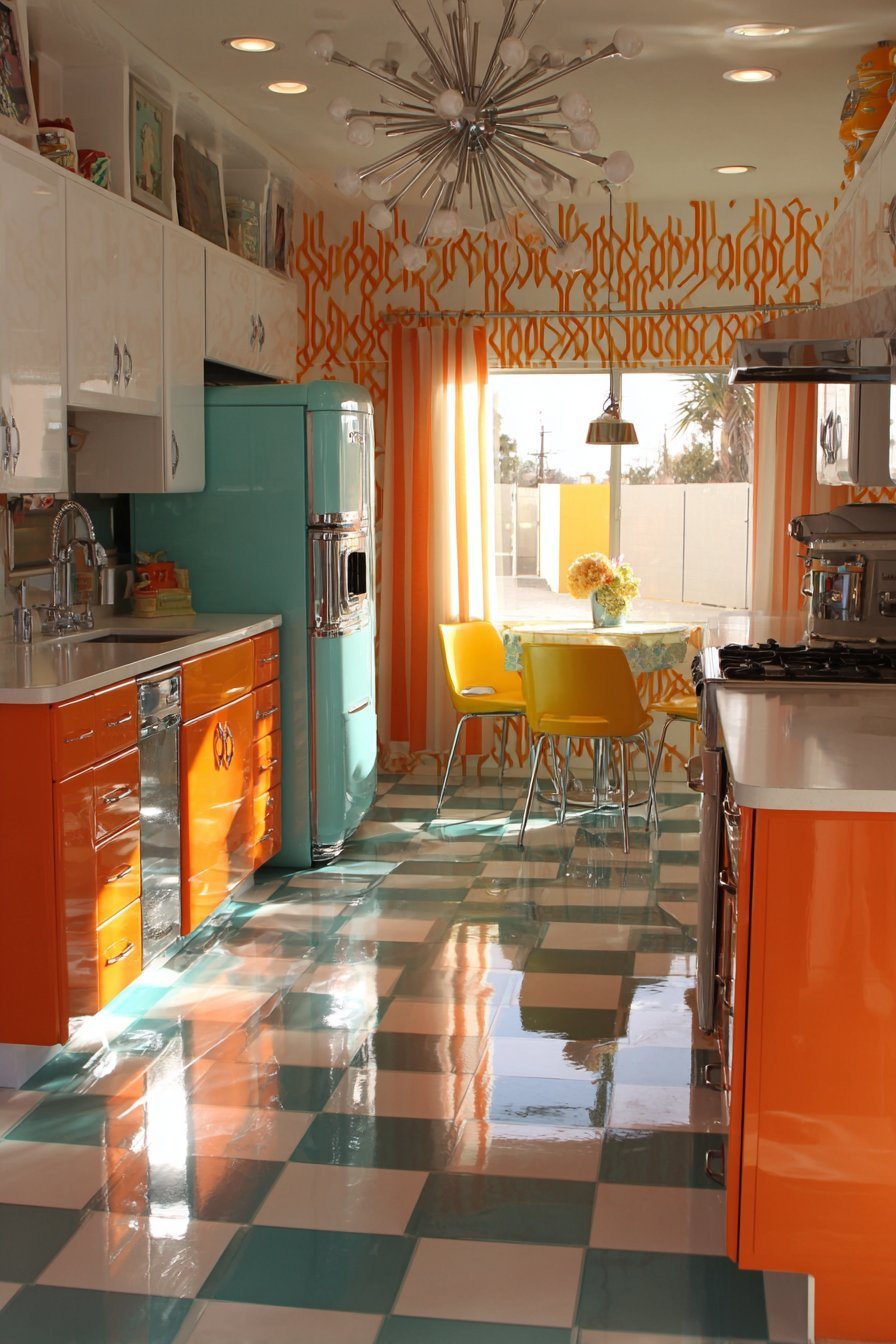 Chrome hardware and light fixtures add sparkle throughout. Period-appropriate shine enhances the cheerful color palette. Vinyl flooring in white with pink and orange geometric patterns ties elements together. A large aluminum-framed window floods space with natural light. The abundant illumination enhances the optimistic color scheme.