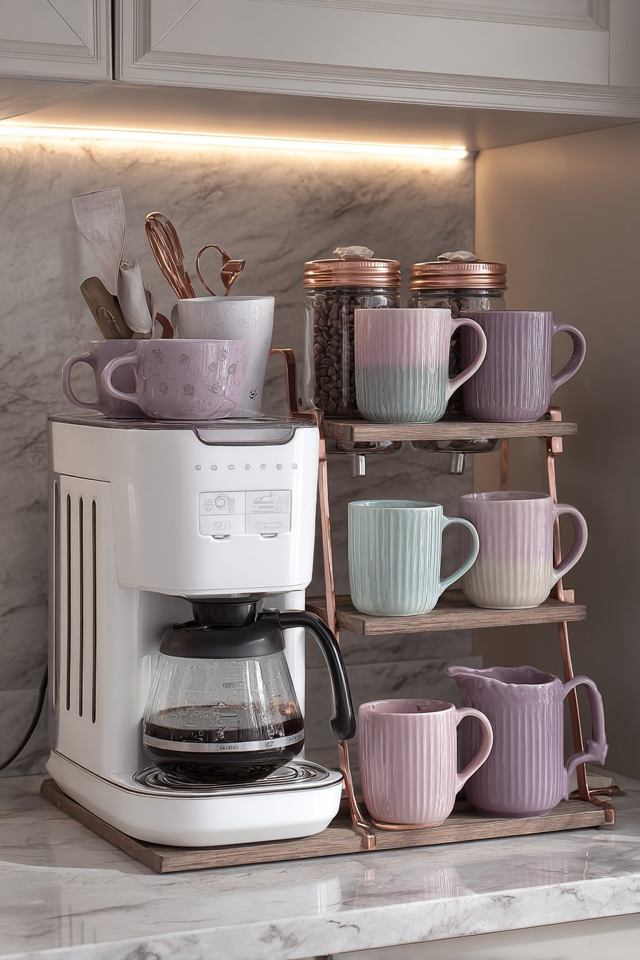 A white automatic drip coffee maker with glass carafe creates the beverage station. A wooden mug tree holds ceramic mugs in various pastel colors. Sugar bowls with spoons and cream pitchers coordinate in mauve tones. Laminate countertops show subtle grey marble patterns.