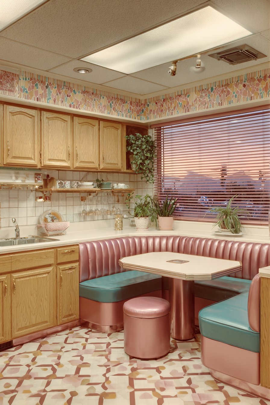 Professional photography captures how natural daylight enhances the dining area. The banquette offers comfortable seating while maximizing space efficiency. Chrome details catch light throughout the day. This practical solution demonstrates how 80s design balanced aesthetics with functionality.