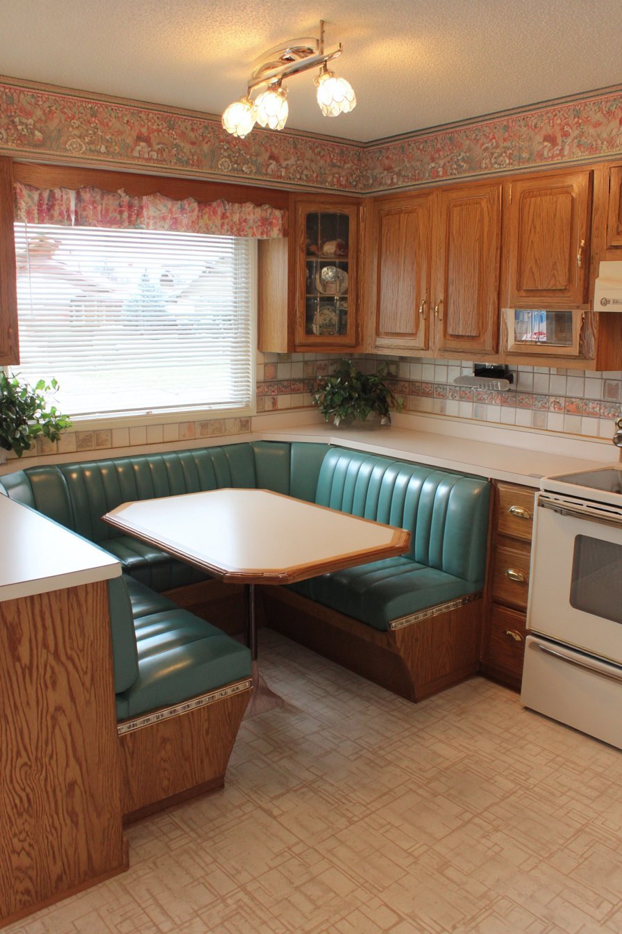 A built-in banquette with teal vinyl upholstery creates the perfect breakfast nook. Light oak trim frames the seating area with precision. The matching laminate table displays a distinctive grey marbled pattern with chrome edge banding. This combination delivers both durability and period-accurate styling.