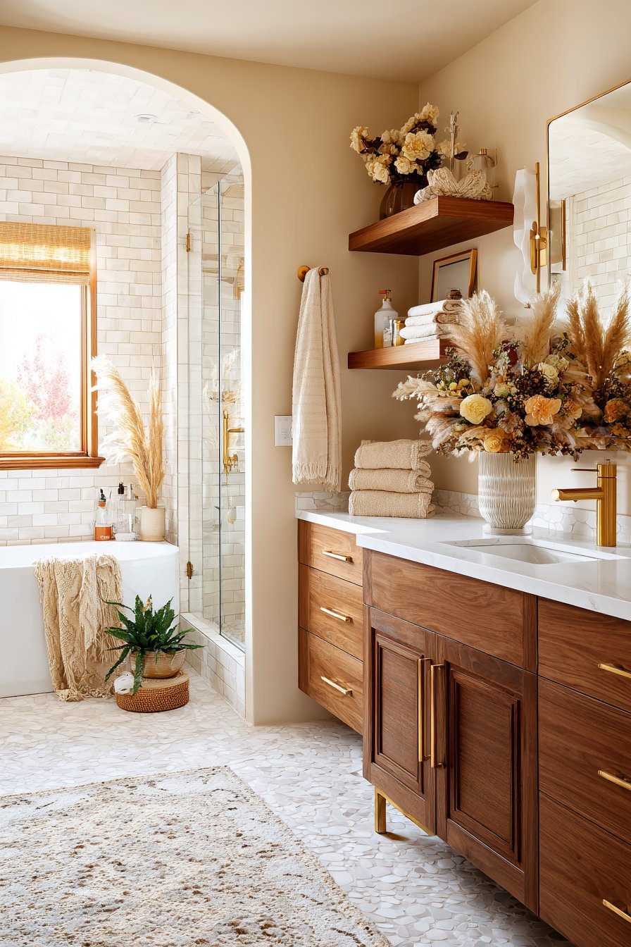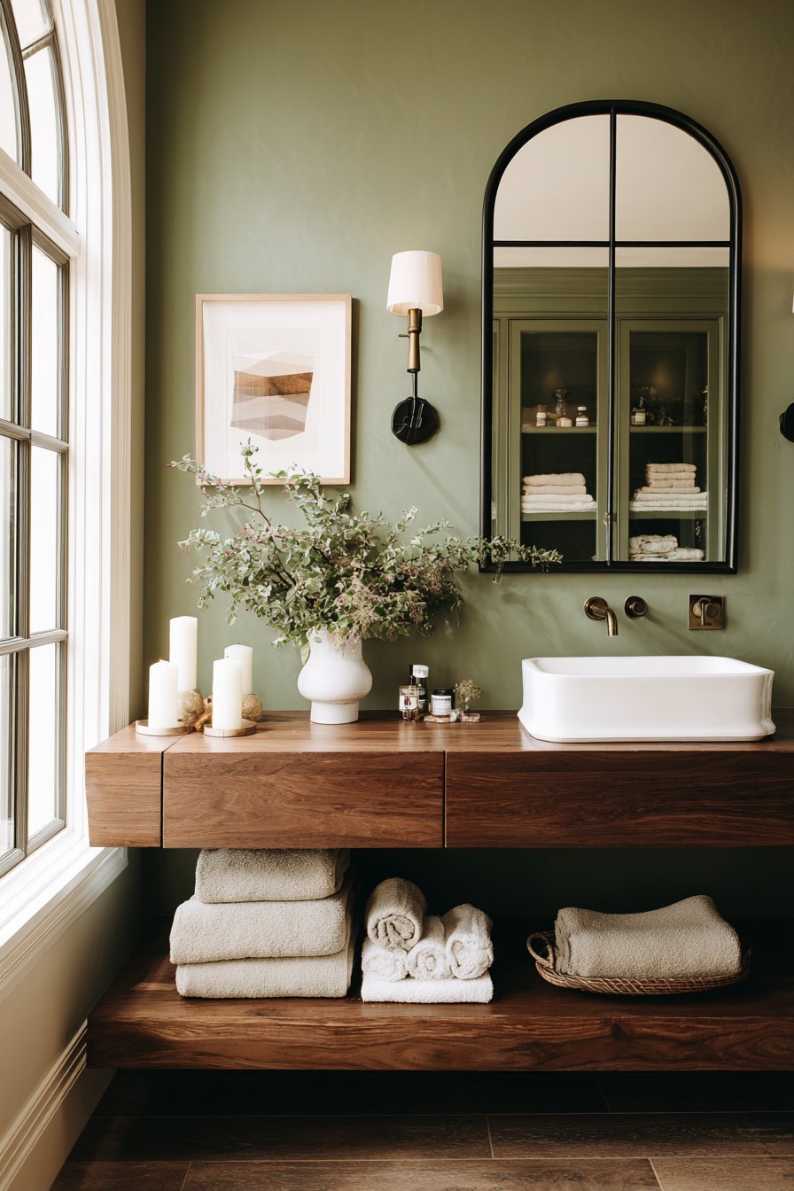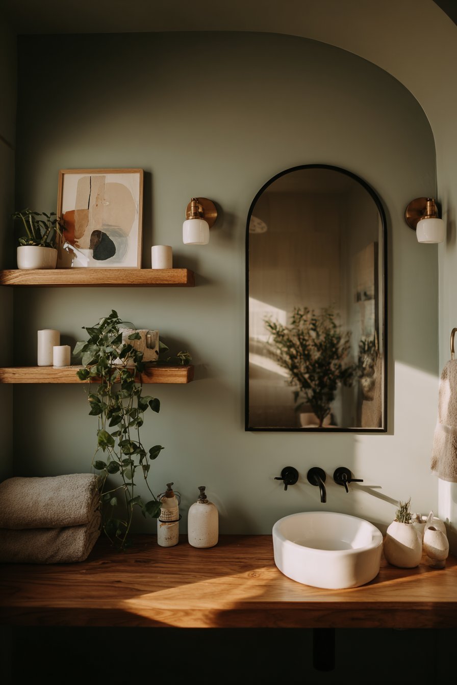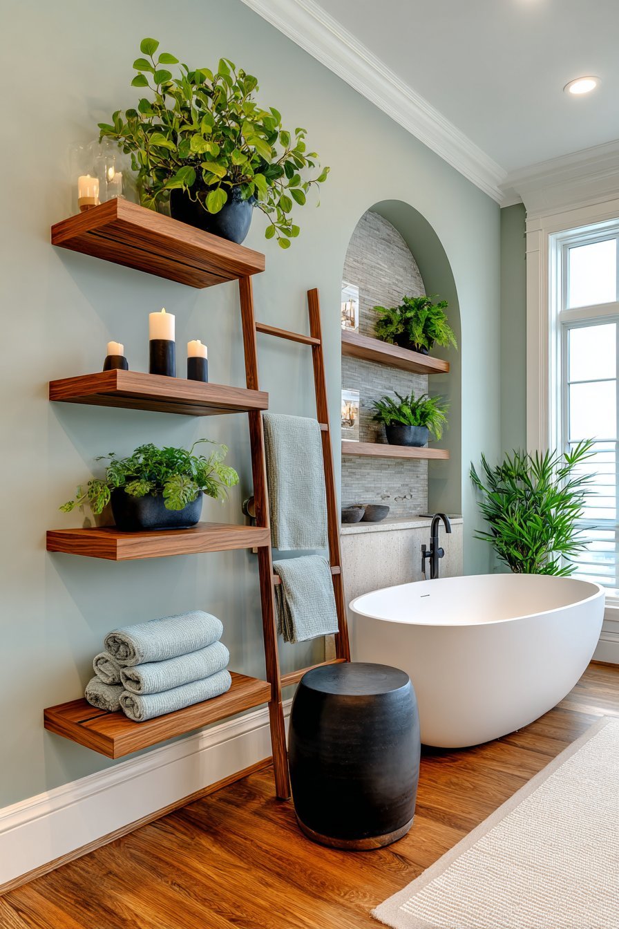 Floating shelves and wall-mounted storage serve a dual purpose. They’re both decorative and functional. Use them to display curated collections of candles, plants, folded towels, and small ceramics. Keep arrangements intentional and edited. A few beautiful objects thoughtfully arranged will always look better than a crowded collection of miscellaneous items.