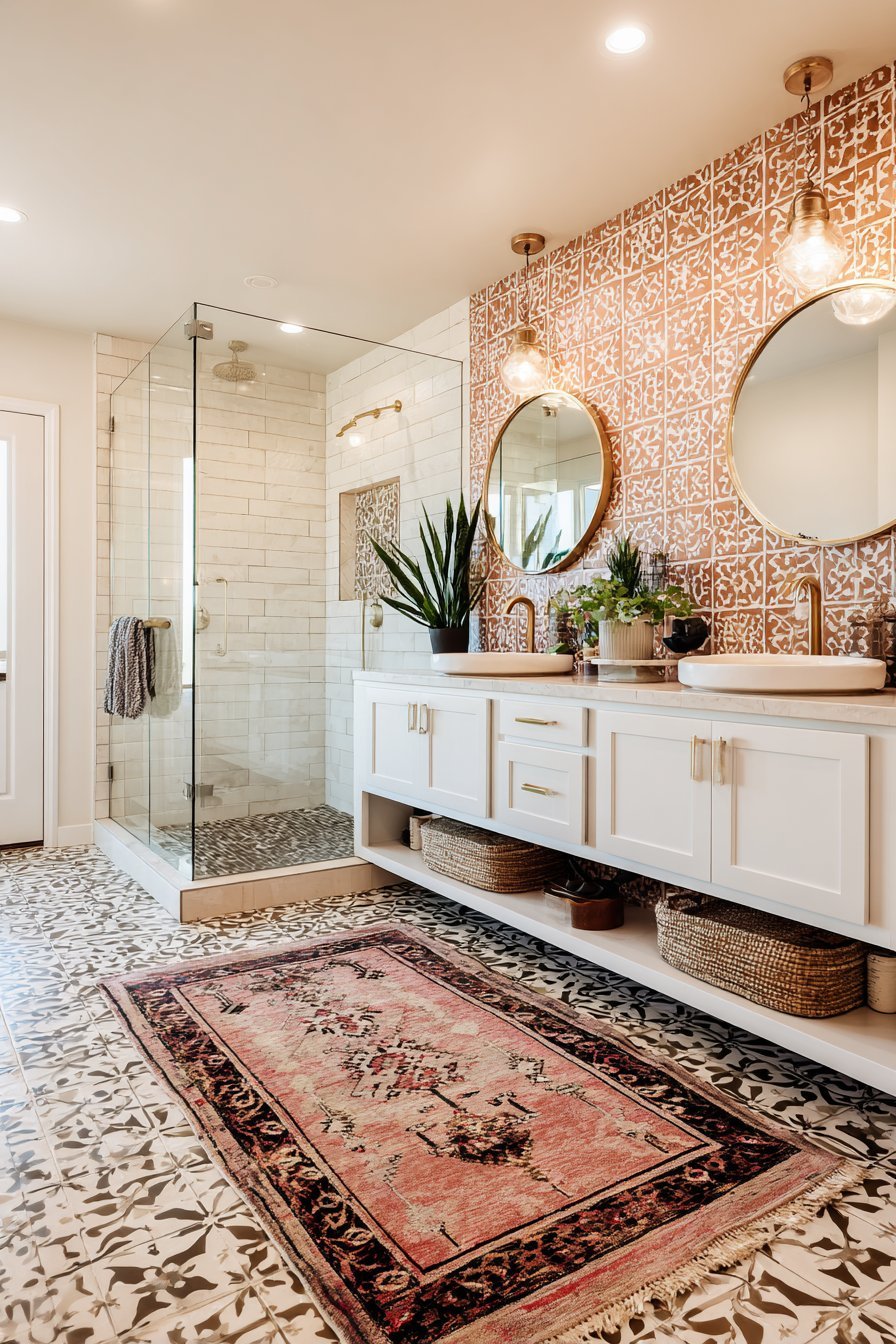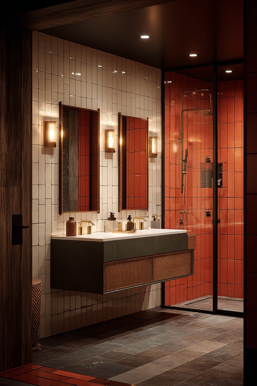 Warmer tones like terracotta, warm sand, and blush bring a sense of warmth and coziness to the bathroom. These work beautifully in bathrooms with warm-toned wood accents and brass or gold fixtures. They’re especially effective in rooms where you want a luxurious, enveloping feel rather than a crisp, clean one.
