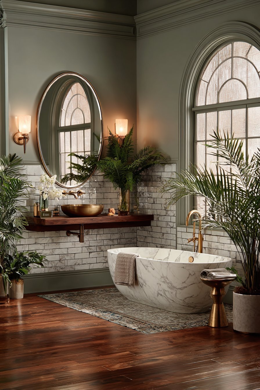 The secret to a harmonious bathroom palette is deciding whether the overall tone is warm or cool — then committing to it. If your fixtures are chrome (cool), lean toward cool whites, soft grays, or blues. If your fixtures are brass or gold (warm), lean toward warm whites, creams, sage greens, or terracotta tones.