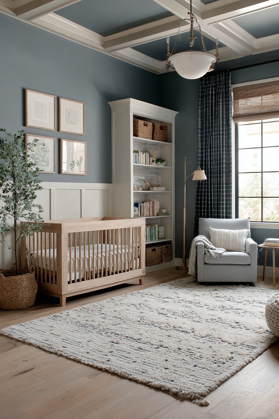 White sheer curtains filter morning light beautifully across hardwood floors. The gentle illumination creates a soothing atmosphere throughout the day. A plush wool area rug in muted blue tones adds warmth underfoot. The soft texture invites comfortable floor play as your baby grows.
