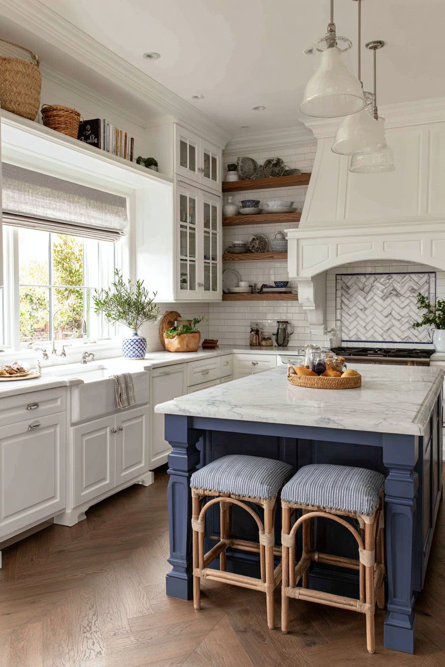 Creamy white perimeter cabinets maintain the classic foundation. The navy blue painted island creates striking visual contrast. Open shelving on the island displays white ironstone dishes. This practical storage doubles as attractive display space. Butcher block countertops warm the island surface.