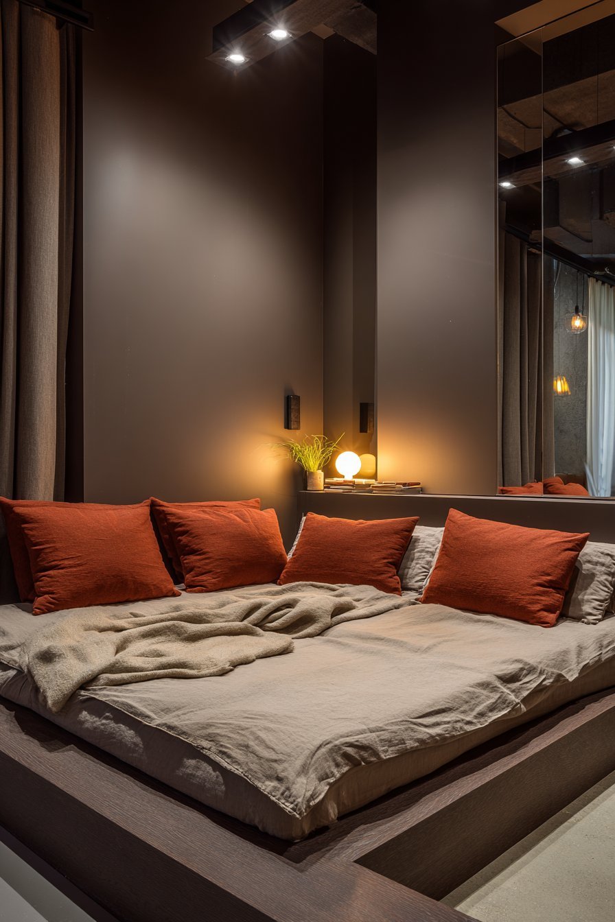 Dark rooms reveal clutter more obviously than light ones because items don’t blend into walls. This natural tendency toward visual organization becomes an asset when embraced intentionally. Dark earthy bedrooms almost demand that we clear unnecessary items, creating inherently calmer spaces. The color scheme itself encourages the discipline that supports restful environments.
