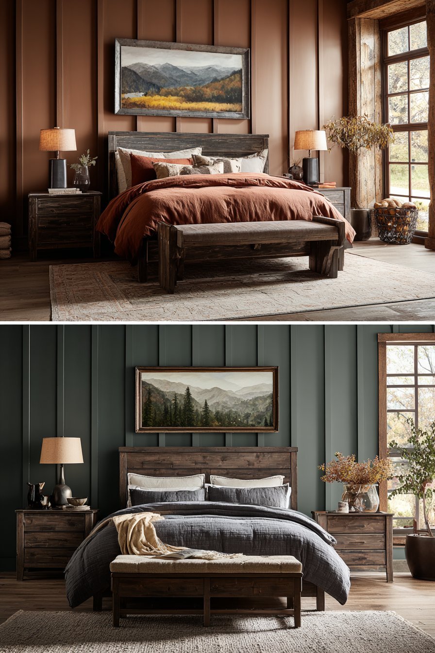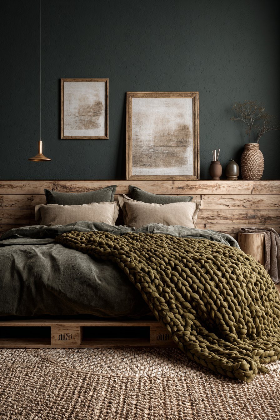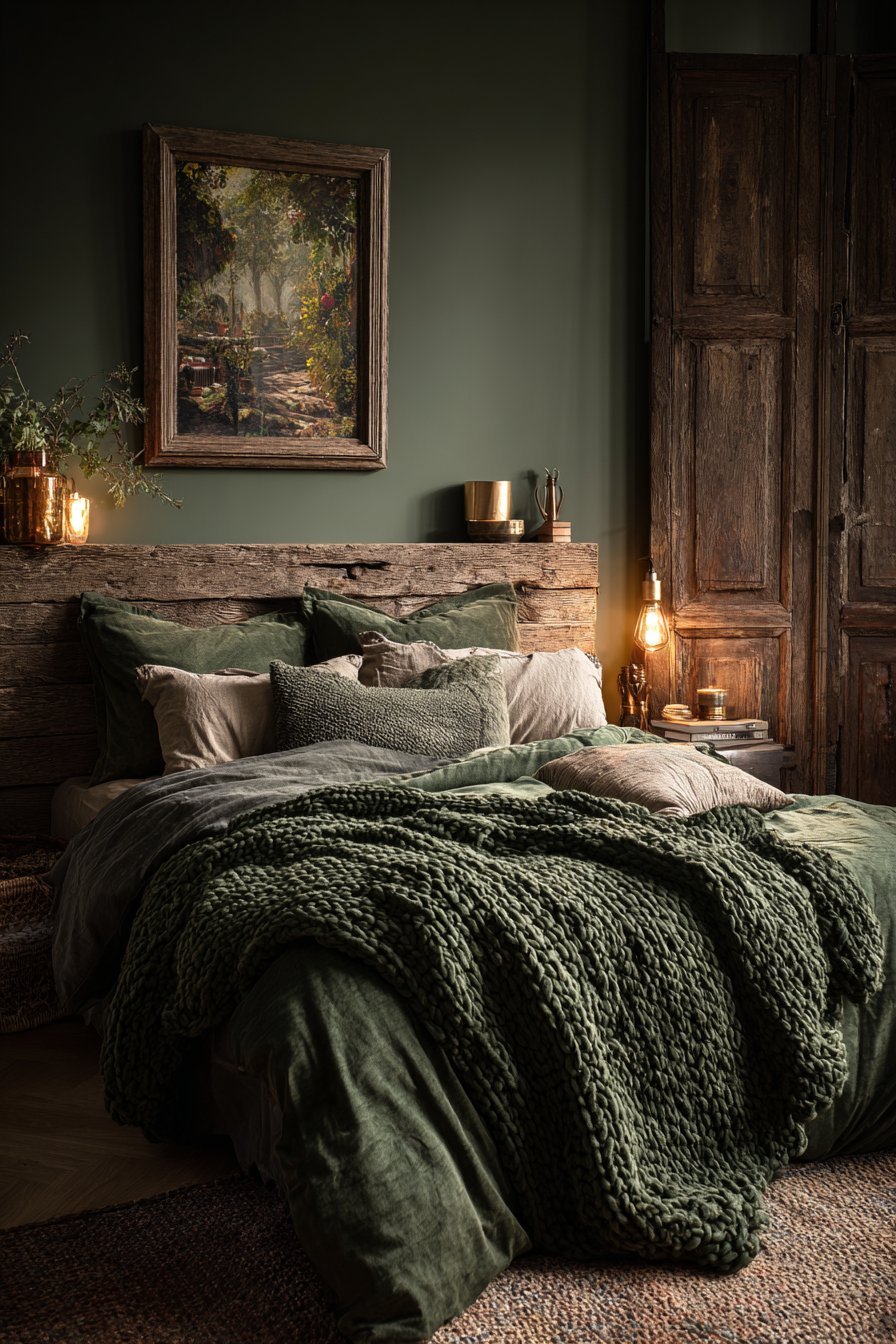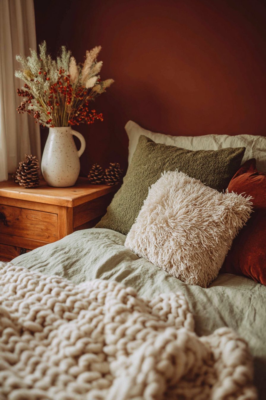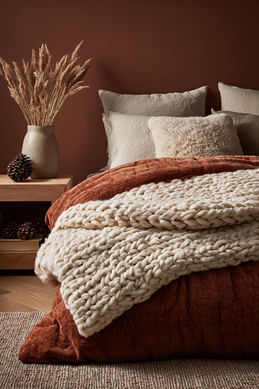 Dark earthy bedrooms adapt beautifully across seasons with minimal changes. In winter, layering heavier textures like velvet, wool, and faux fur amplifies the cozy factor. The dark palette that might feel too heavy in summer becomes perfectly warming when temperatures drop. Add a chunky knit throw and swap to flannel sheets for instant seasonal transformation.