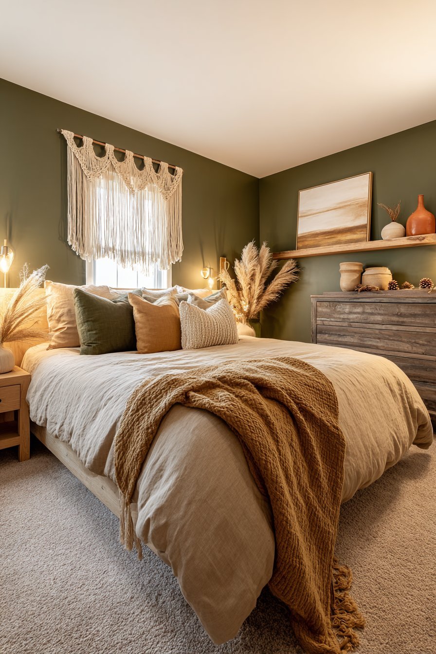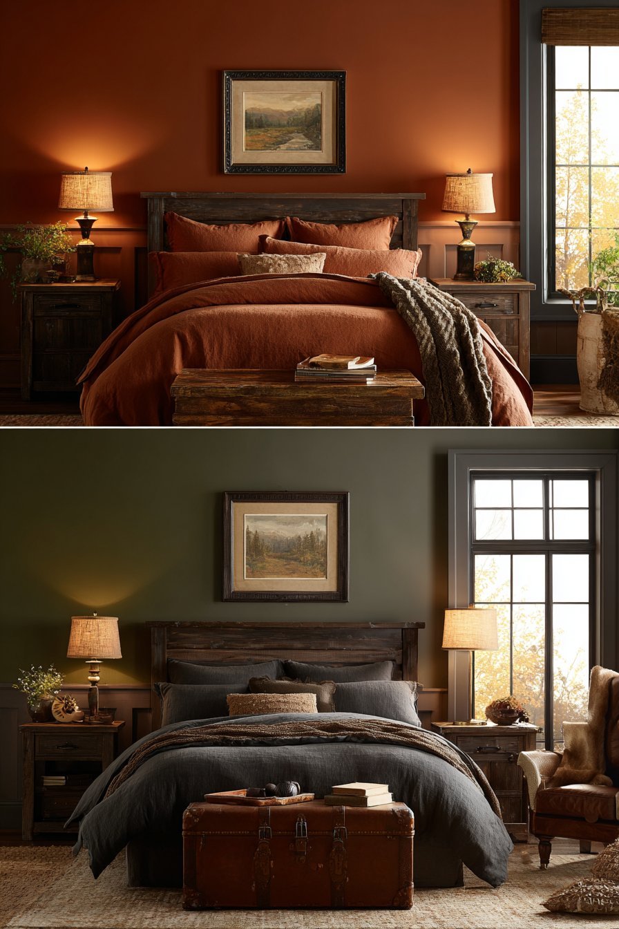 Summer adaptation focuses on breathability and lighter textures within the same color family. Linen bedding in lighter earth tones, removing heavy layering pieces, and maximizing airflow prevents dark rooms from feeling stifling. The wall colors remain constant, but textural changes completely shift the room’s temperature perception. Open windows for cross-ventilation and use lighter cotton rather than heavy wool.