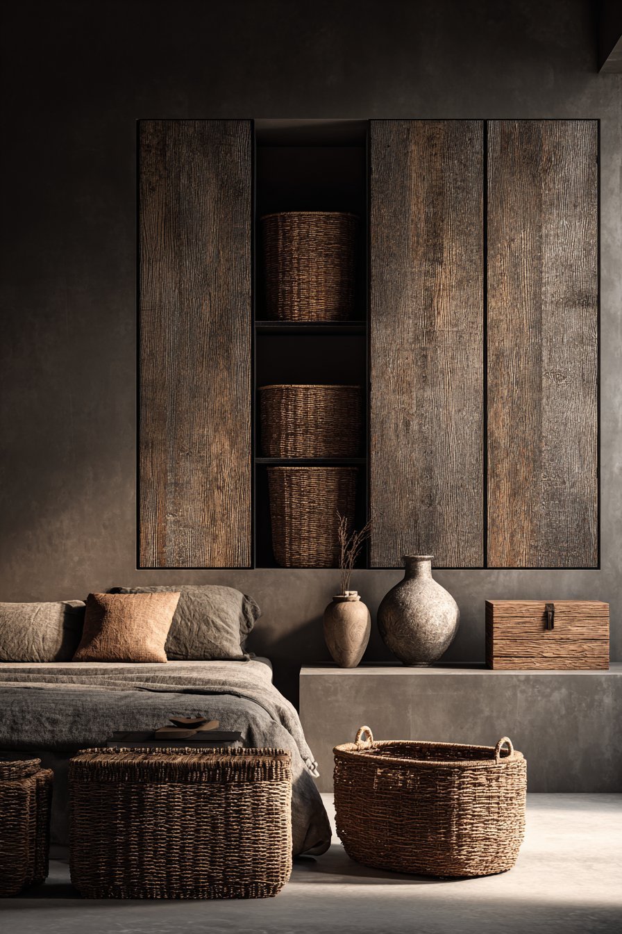 Storage solutions in matching dark tones help maintain visual cohesion. Closed storage rather than open shelving prevents the eye from catching on multiple objects and colors. Woven baskets, wooden boxes, and fabric bins in coordinating earth tones hide necessities while contributing to the room’s textural richness. Everything has a place, and that place is visually integrated.