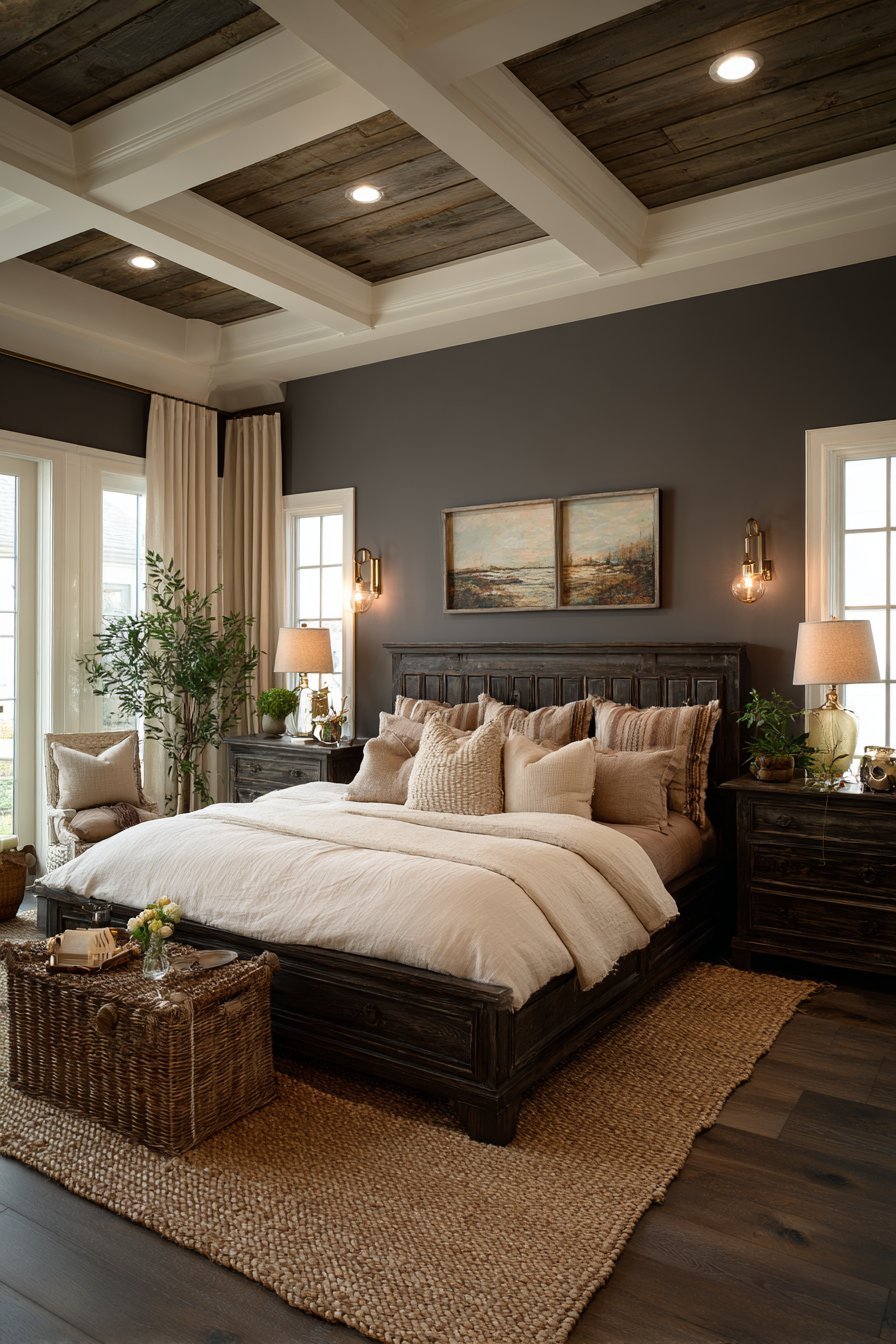 Ceiling color deserves special attention in dark bedrooms. Painting the ceiling several shades lighter than walls creates vertical dimension that prevents the room from feeling like a cave. The lighter ceiling also reflects light downward more effectively, improving overall illumination. Consider warm white or the lightest version of your wall color.