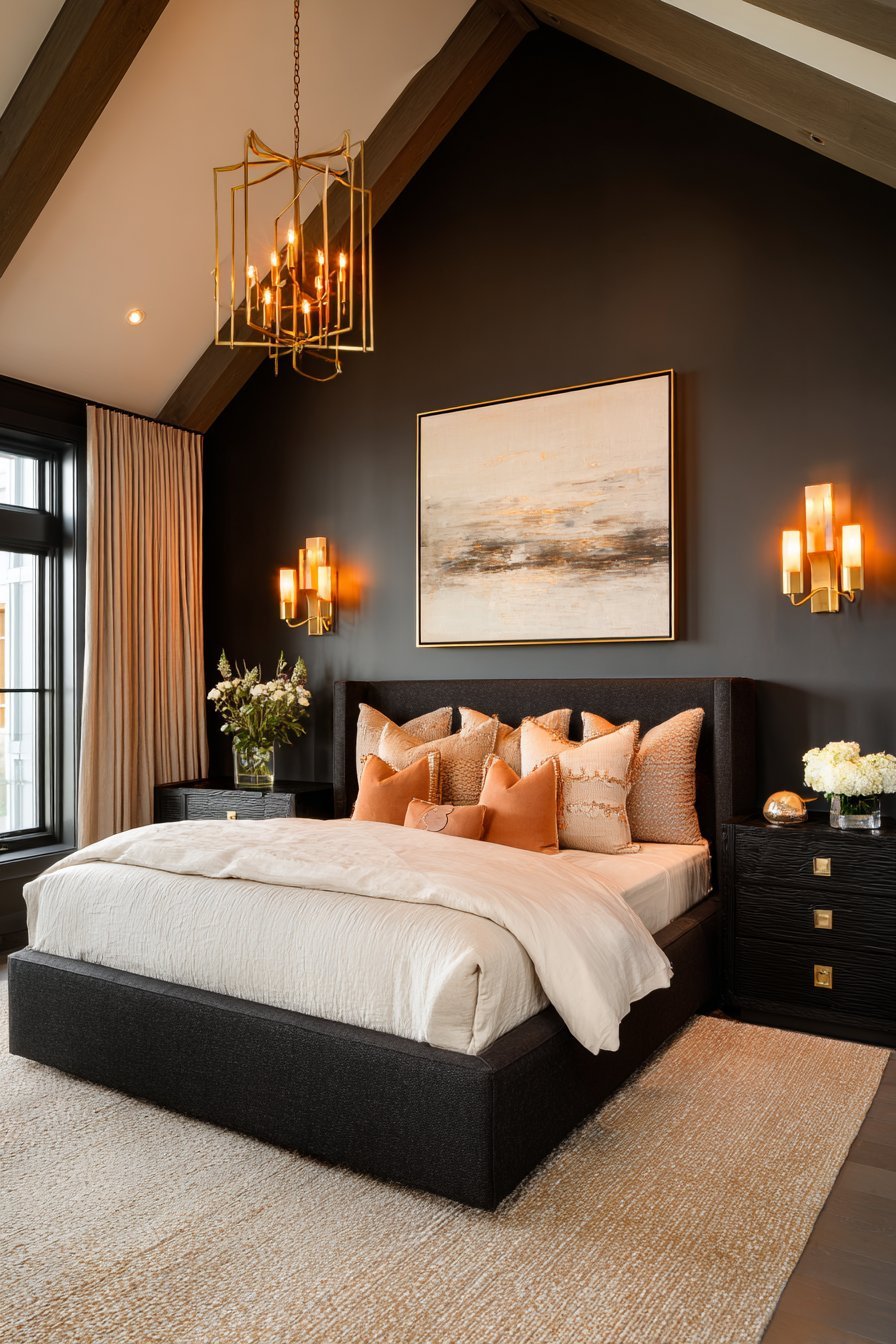 Entirely dark rooms can feel oppressive without careful balance. Strategic lighter elements prevent heaviness while maintaining the grounding effect. A cream-colored linen duvet on a dark bed frame creates essential contrast that allows the eye to rest. The darkness remains dominant, but lighter accents provide visual relief points.