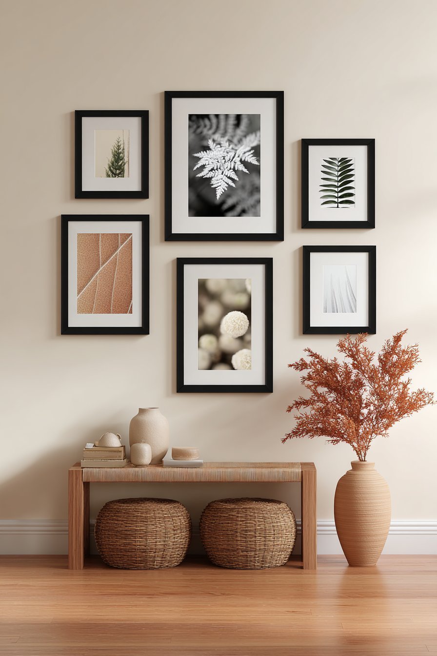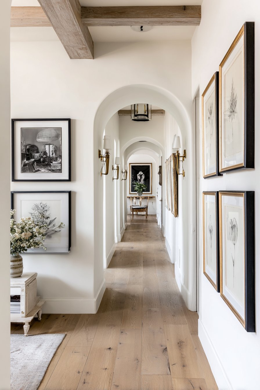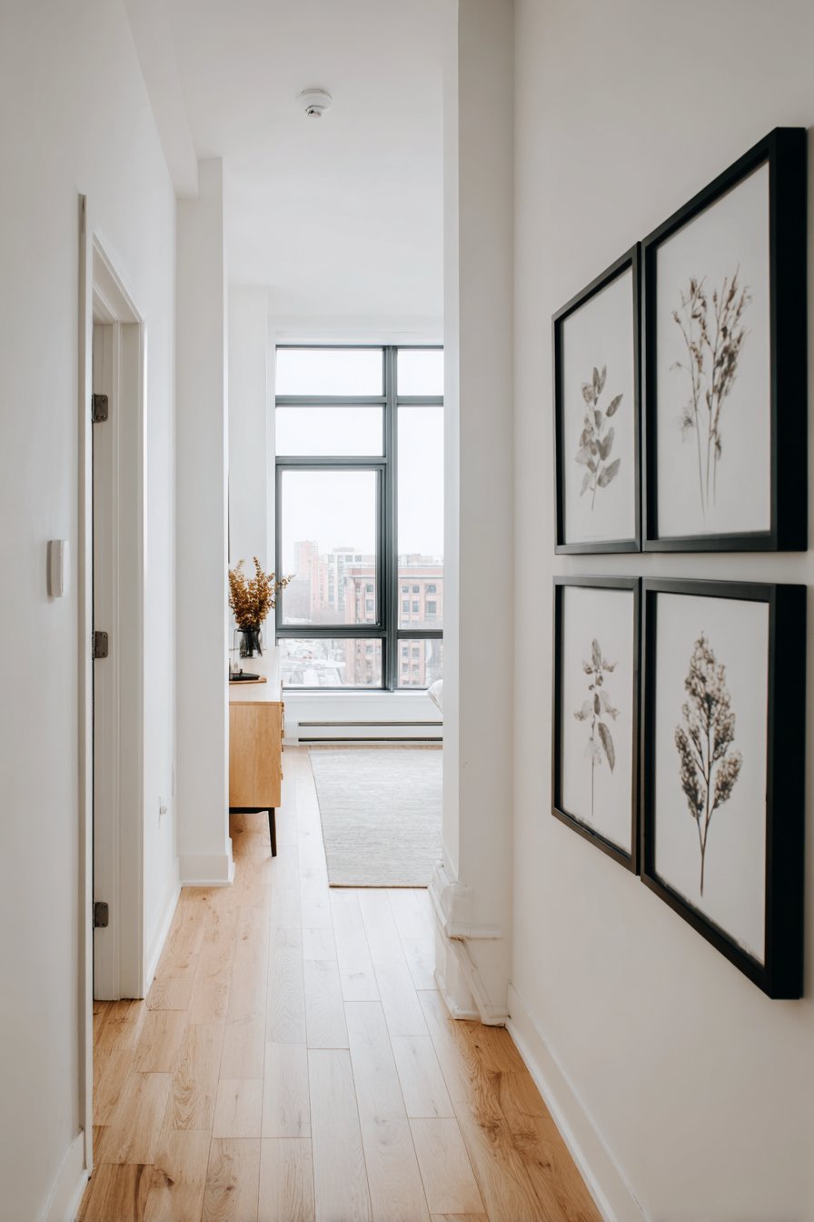 Start by selecting a unified color palette across all framed pieces. Matching frame finishes — all black, all gold, or all natural wood — creates harmony. Mixed frames require a more skilled curatorial eye. For most hallways, consistency is the safer and more elegant choice.