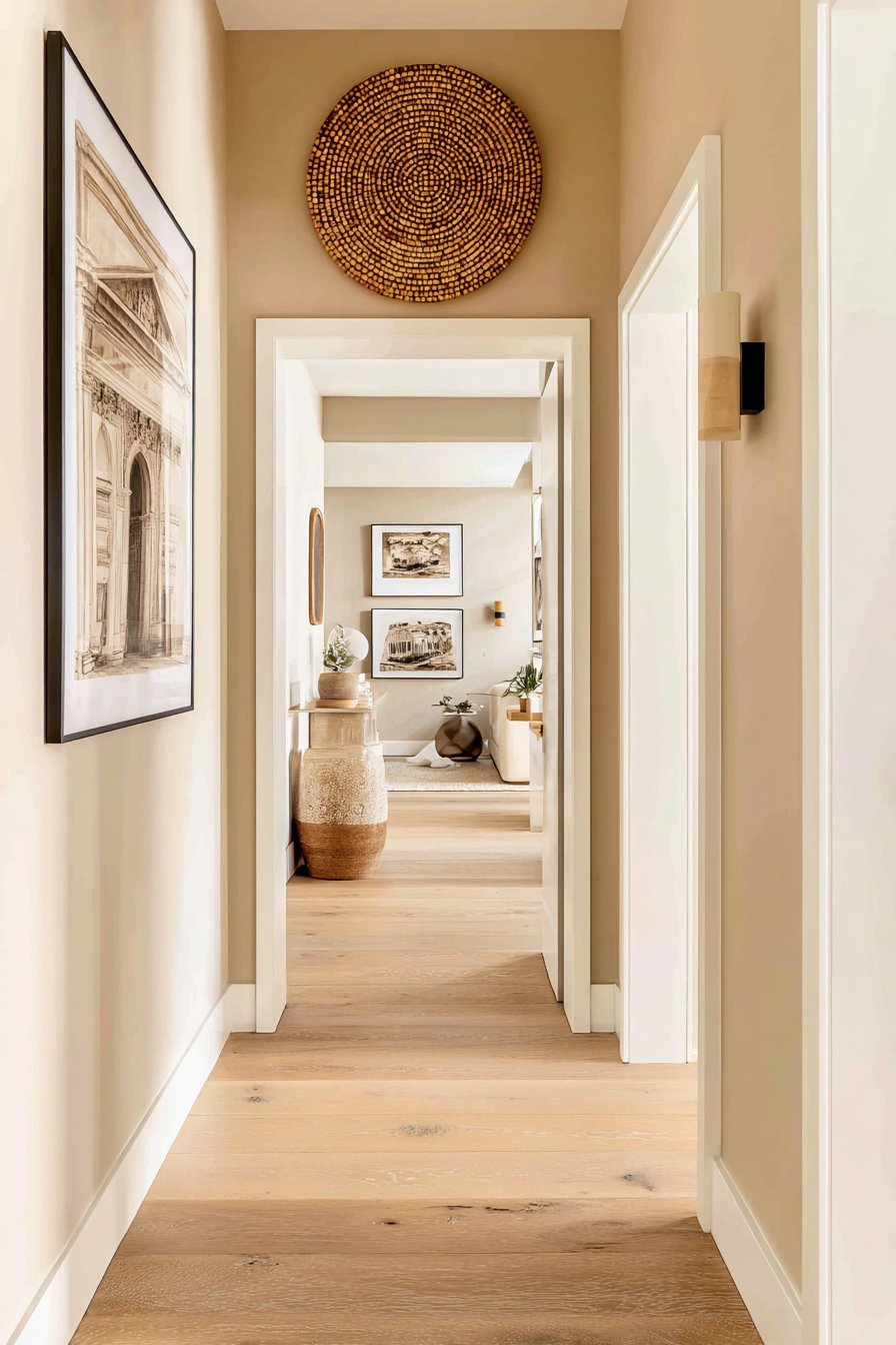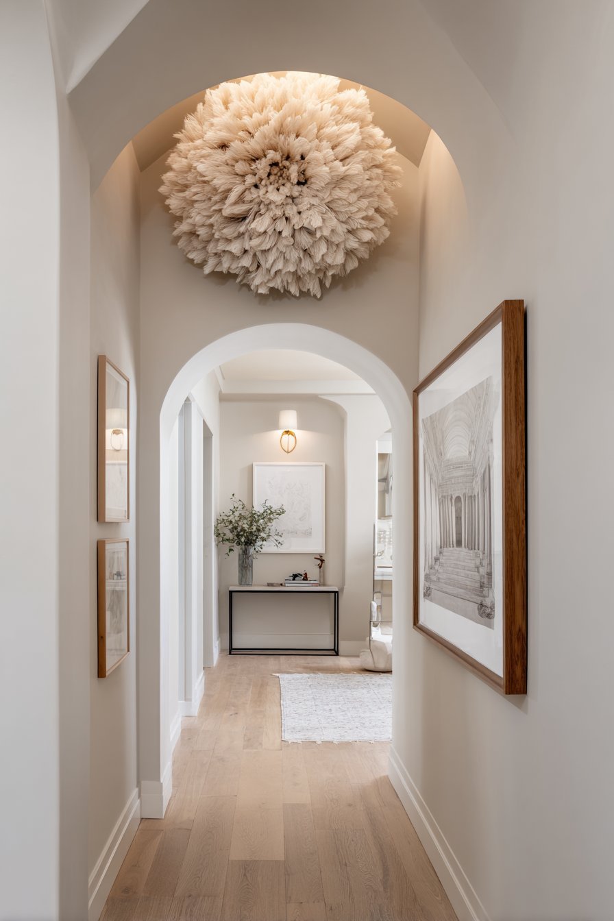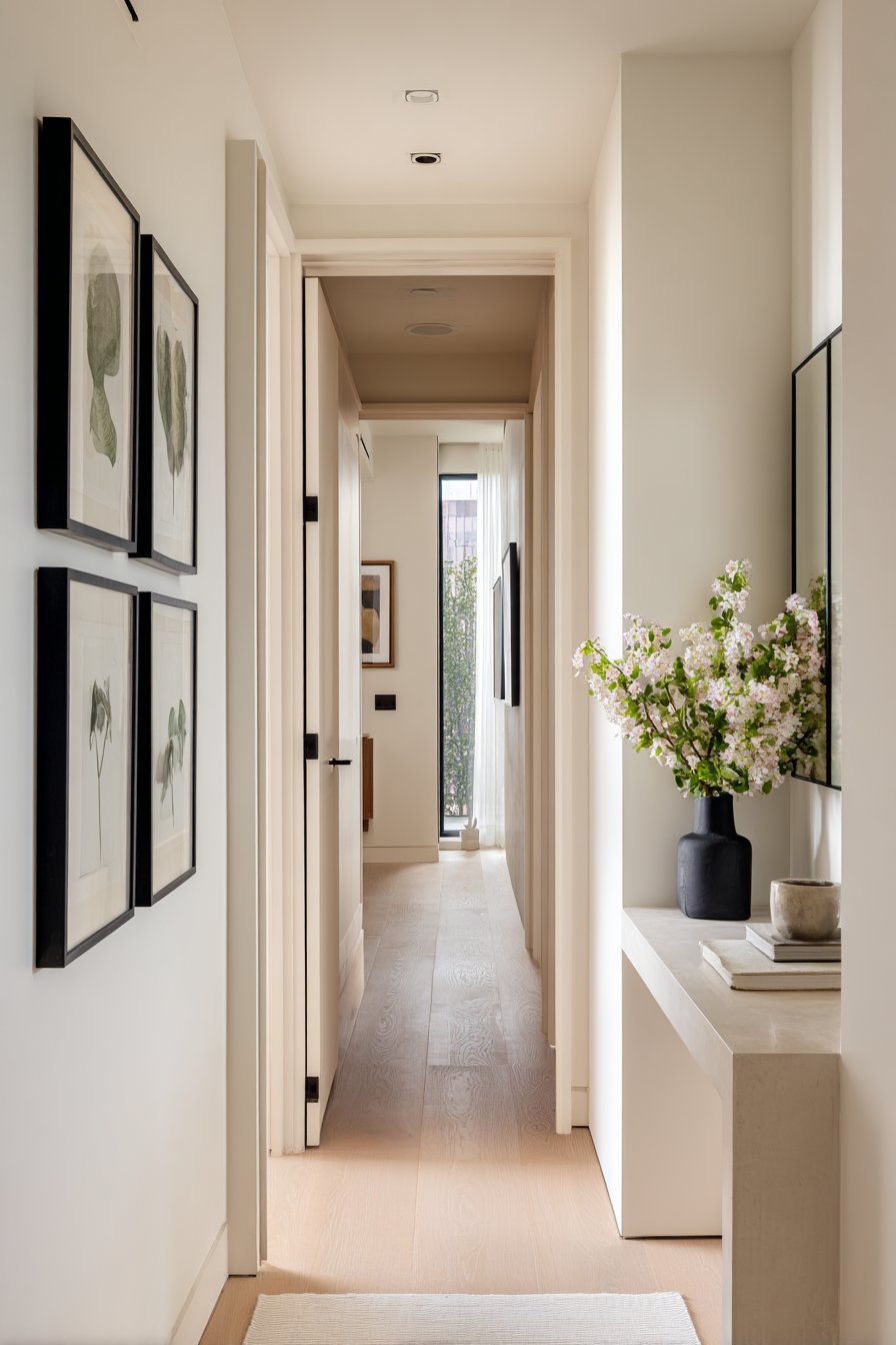 One of the most important principles in hallway design is vertical placement strategy. Hanging decor too low visually divides the wall and makes the ceiling feel closer. Keeping artwork and objects at eye level or above encourages the eye to travel upward, which creates a feeling of spaciousness.