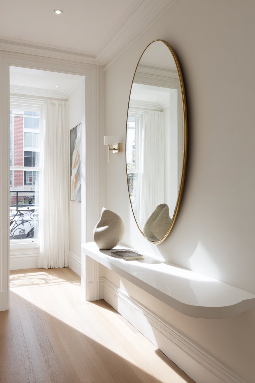 Choose mirrors with slender, elegant frames to maintain a sense of lightness. Oversized round or oval mirrors work particularly well in hallways. They soften the hard lines of walls and ceilings. Arched mirrors are especially trendy and add an architectural quality without adding bulk.