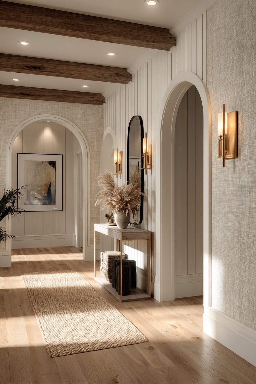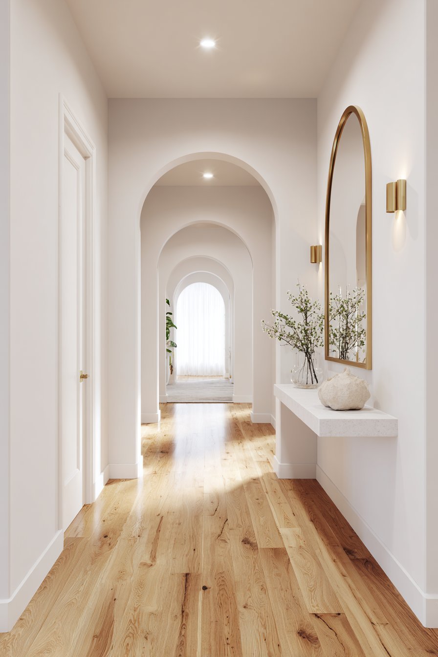 Mirrors are one of the most powerful tools in any interior designer’s toolkit. In hallways, they serve a dual functional purpose — they bounce natural light deeper into the space and create the illusion of a wider corridor. Even a single well-placed mirror can transform a dark, tight hallway into an airy passage.