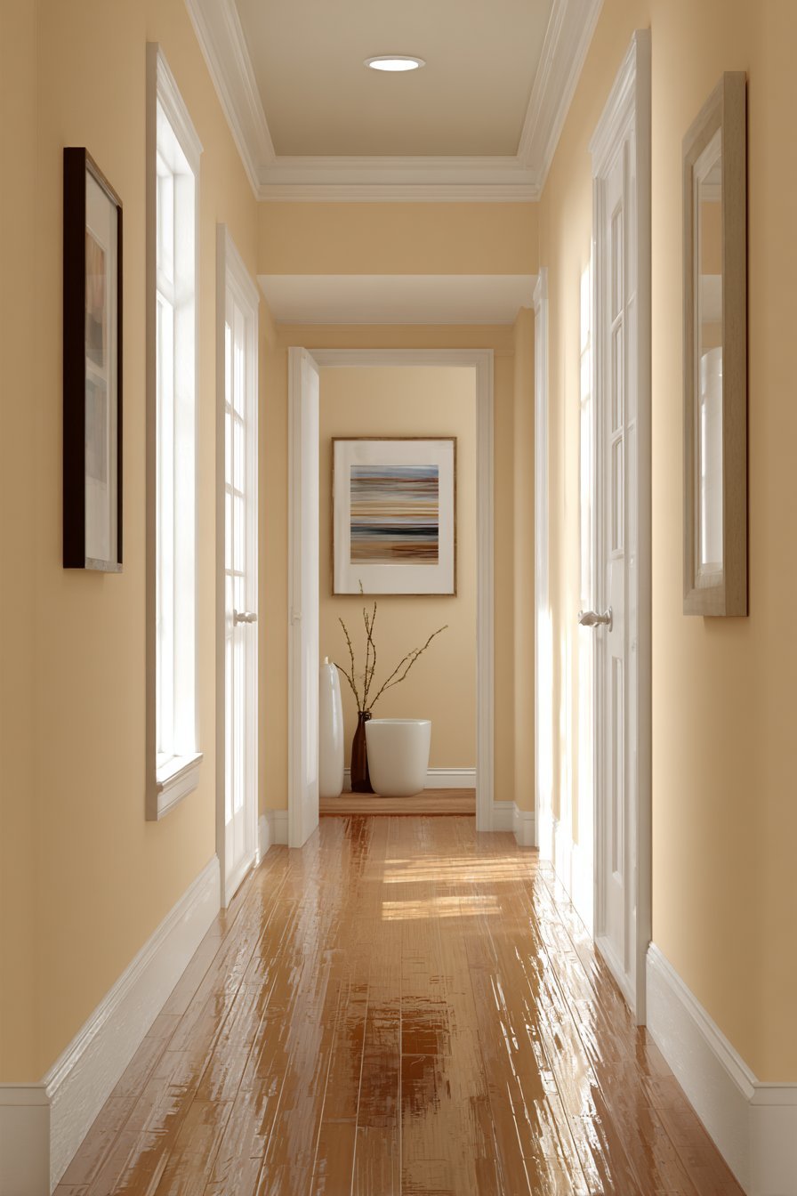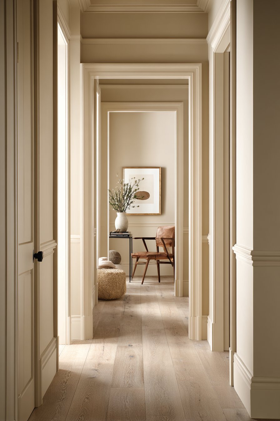 Color has an enormous impact on how spacious a hallway feels. Dark or saturated colors absorb light and visually shrink a space. Light, neutral tones do the opposite. Soft whites, warm creams, pale greiges, and muted pastels reflect light beautifully and make walls recede visually.