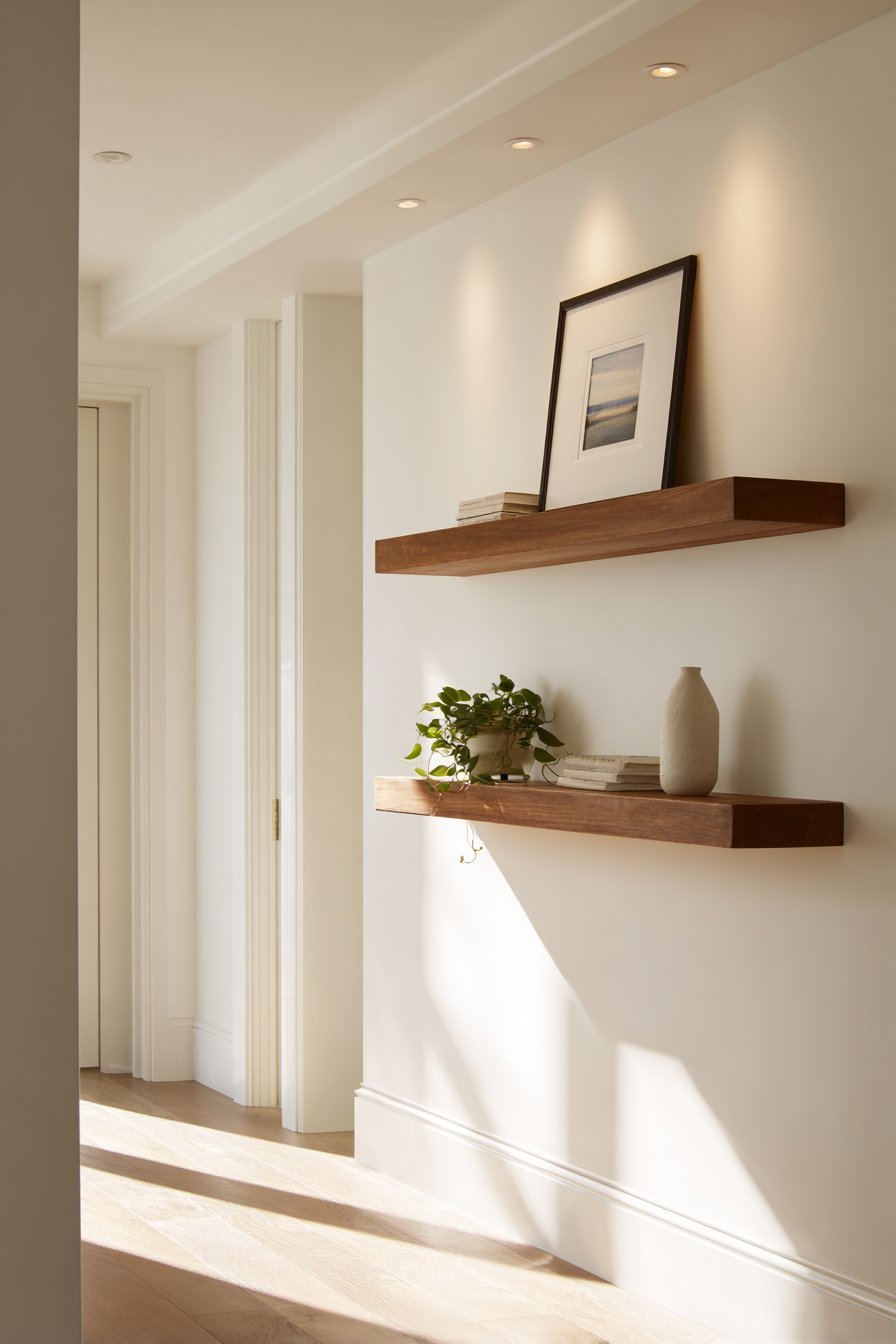 Style the shelves with restraint and intention. A few small plants, a framed photo, and a decorative object are all you need. Avoid overcrowding shelves with too many items. Empty space on a shelf is not wasted — it is a deliberate design choice that keeps the hallway feeling airy.