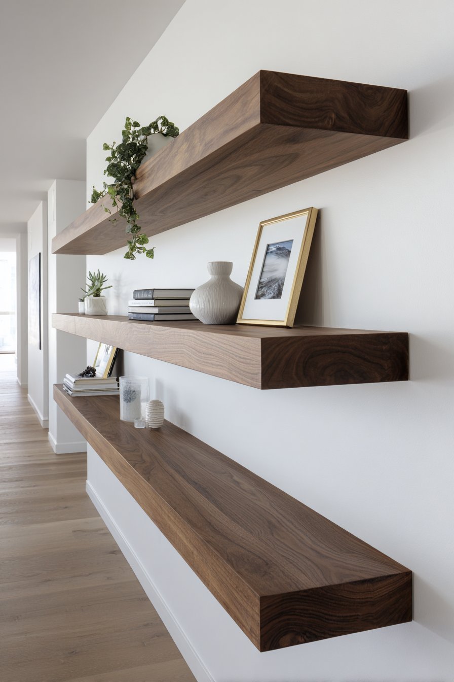 Choose shelves that are shallow in depth — ideally no more than 6 to 8 inches. This prevents them from protruding too far into the walking space. Slim floating shelves in wood, metal, or painted MDF all work well. The material should complement the overall home aesthetic.
