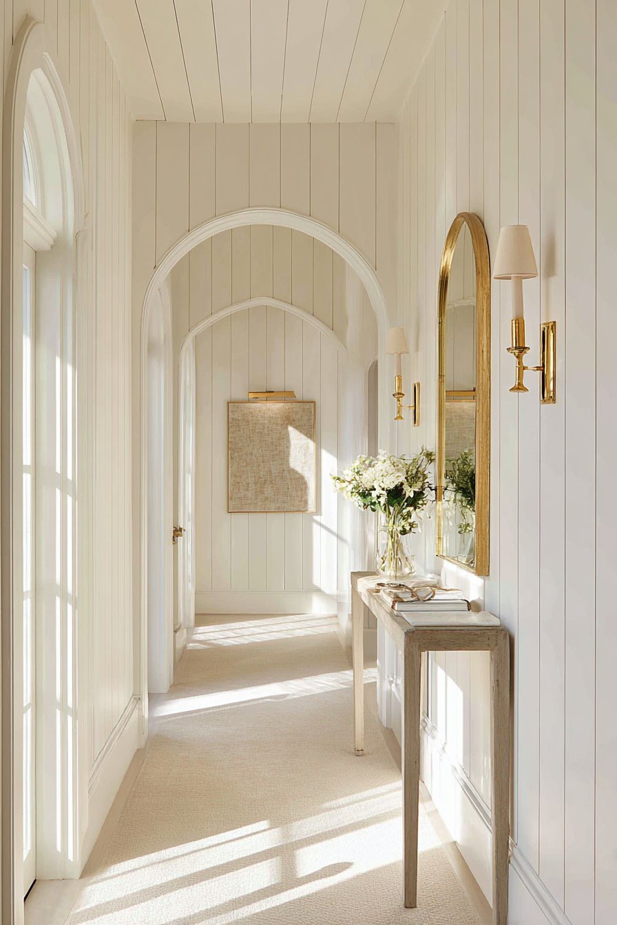 Texture adds depth and dimension to hallway walls without adding visual weight. Shiplap paneling, wainscoting, board-and-batten, or beadboard all introduce architectural interest. These treatments draw the eye along the length of the wall, which visually elongates the hallway.