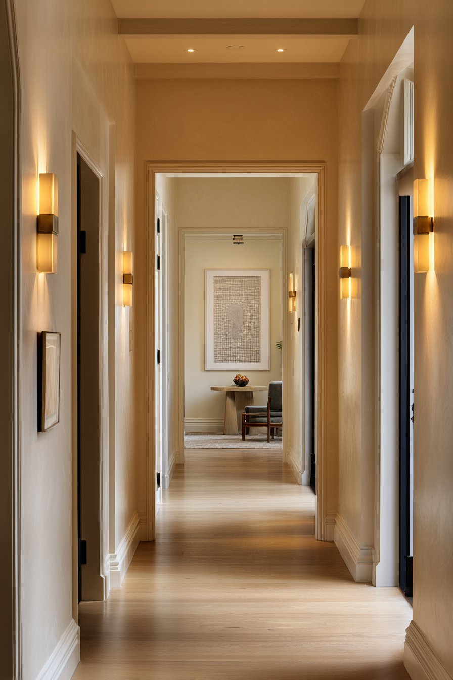 Lighting is one of the most overlooked elements in hallway design. Proper illumination can make a cramped hallway feel welcoming and spacious. Wall-mounted sconces are ideal because they free up floor and surface space while casting warm, ambient light along the corridor.