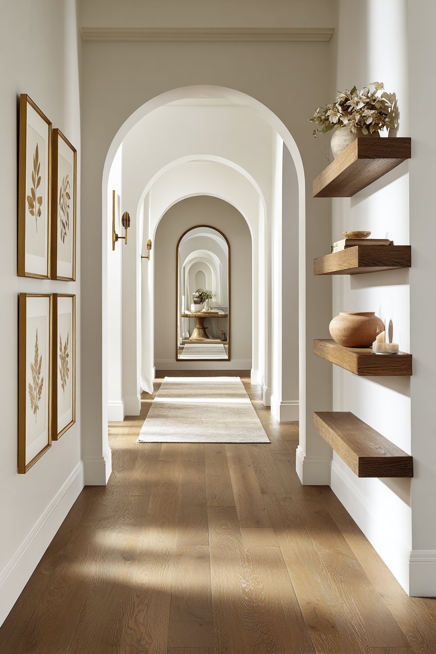 Wall-mounted shelves are a brilliant solution for hallways that need both storage and style. Floating shelves keep the floor clear, which is essential for maintaining an open feel. A clutter-free floor visually widens the corridor and makes movement through it feel effortless.