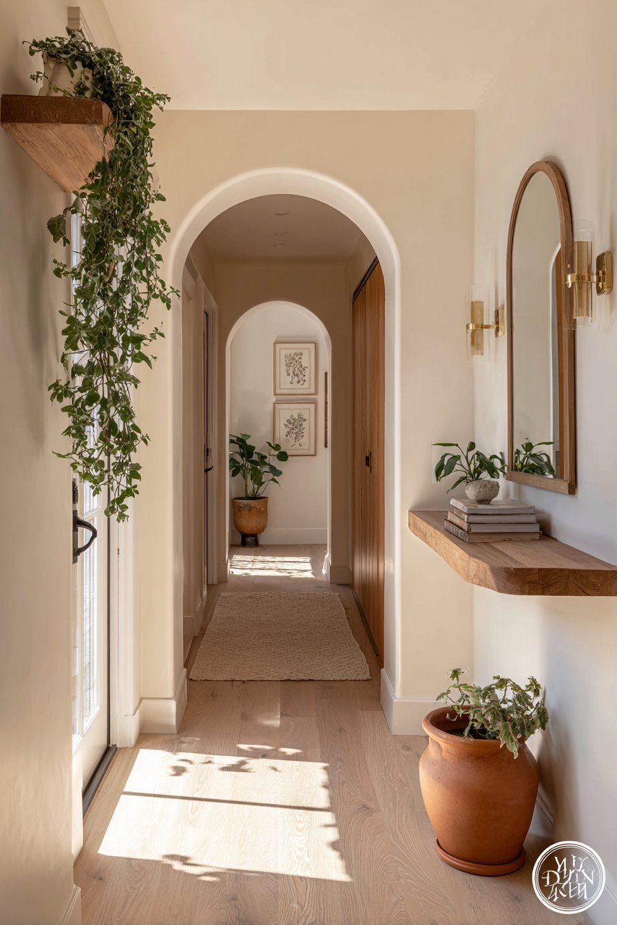 For hallways with limited natural light, faux botanicals have come a long way in quality and realism. High-end artificial trailing plants can add the same visual warmth without the care requirements. Pair them with natural materials like terracotta, woven rattan, or textured ceramic planters to maintain an authentic, organic feel.