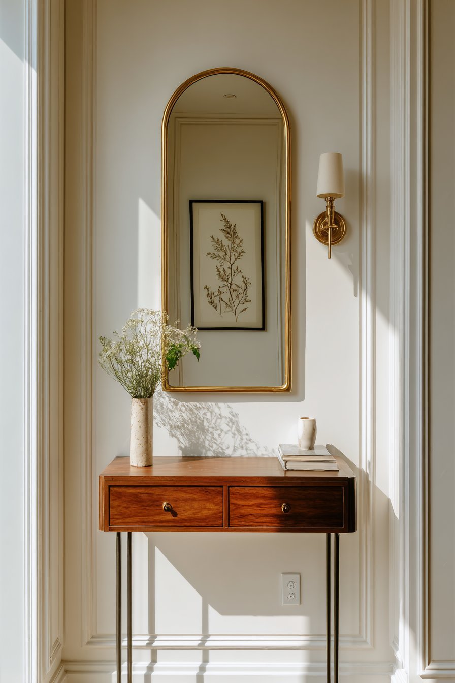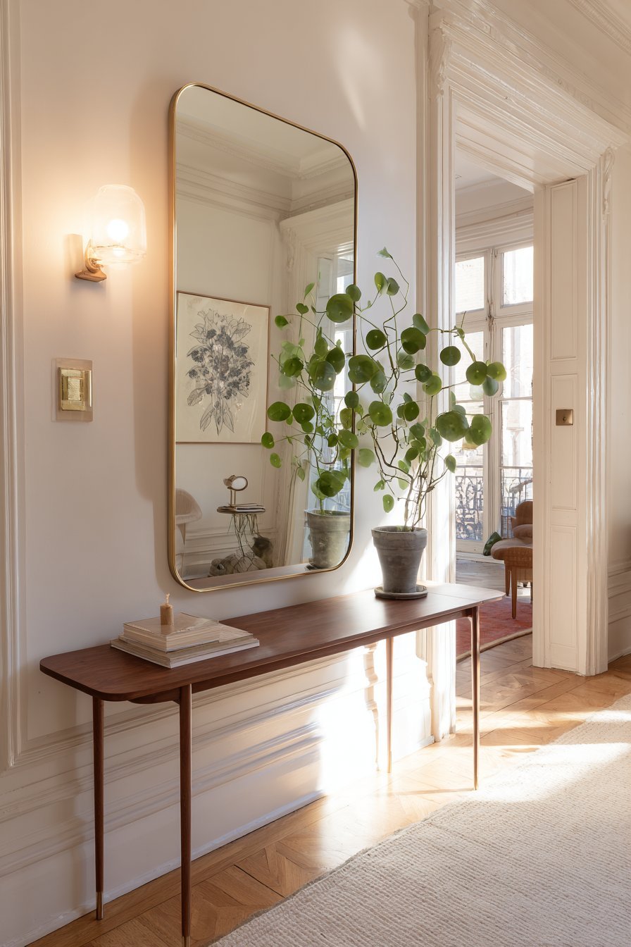 - Pair a mirror with a slim console table below for a functional vignette