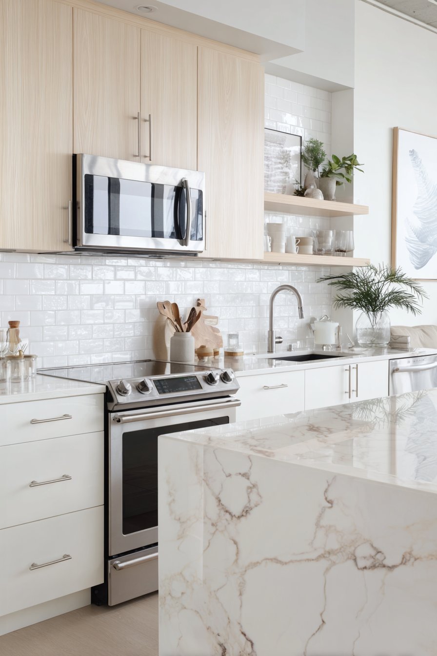 - Select light-colored countertops in quartz or marble with subtle veining