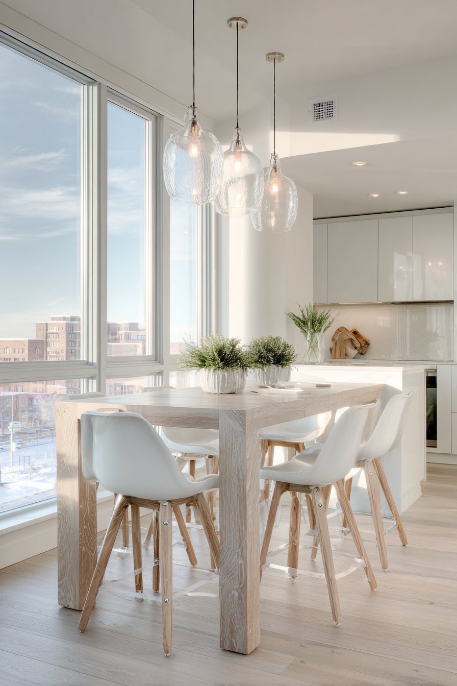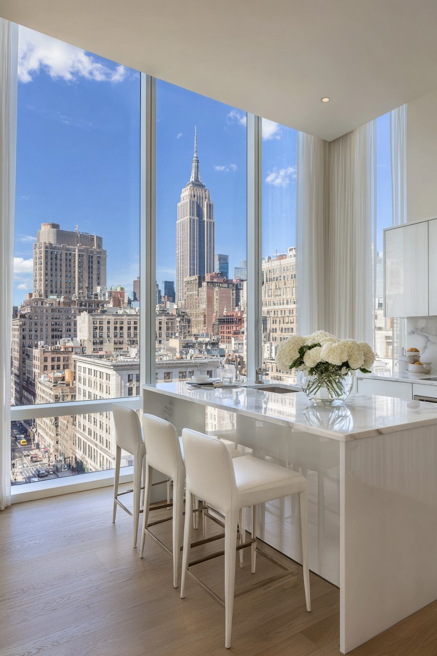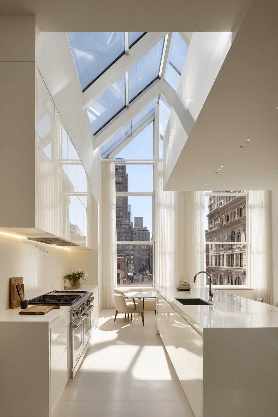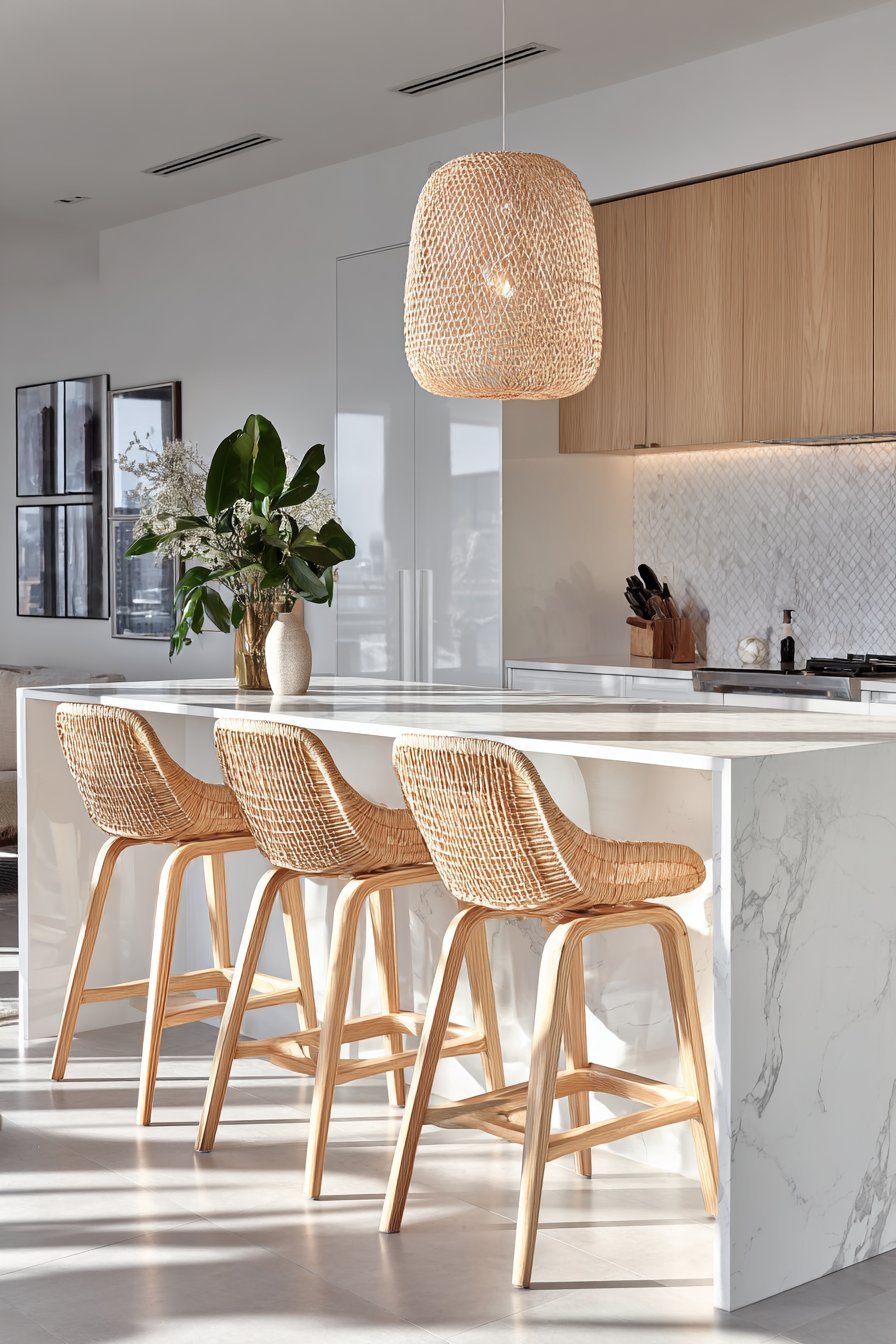 Sheer curtains or light-filtering roller shades provide the perfect balance between privacy and illumination. These treatments soften harsh sunlight without significantly reducing brightness, creating a gentle, diffused glow that enhances the airy atmosphere. If privacy isn’t a concern, leaving windows completely bare creates the most dramatic sense of openness and connects your kitchen to outdoor views.