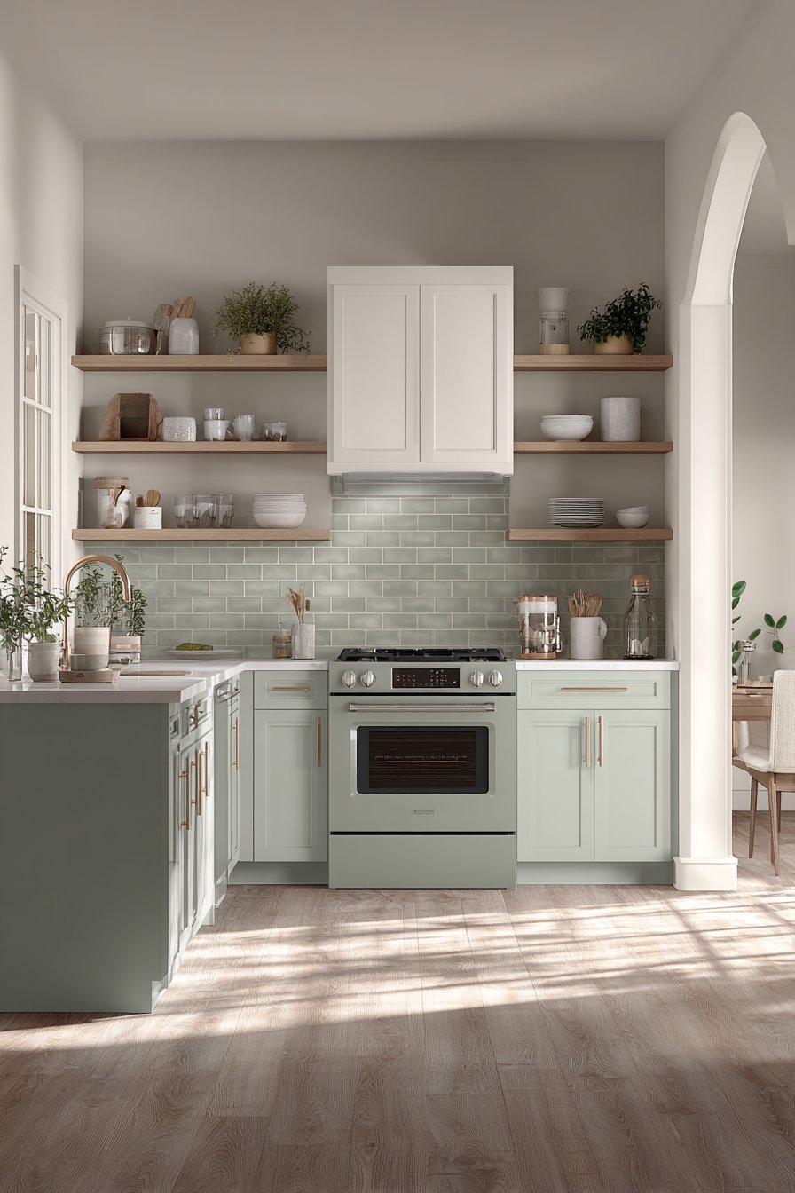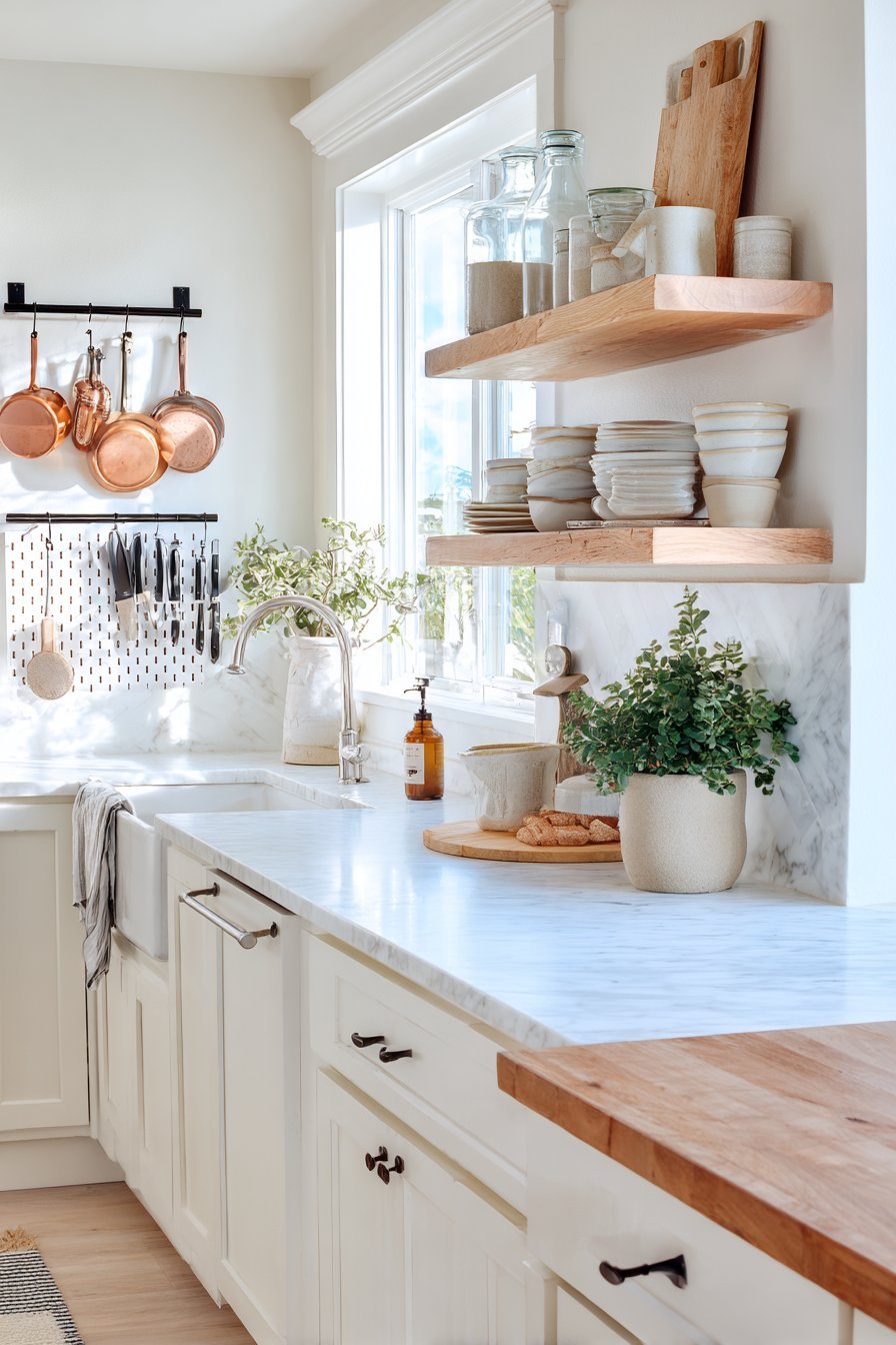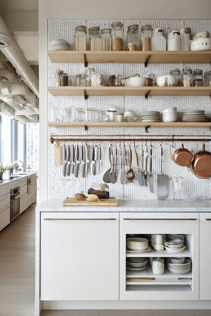 Open shelving creates visual lightness that closed cabinetry cannot match, making it invaluable in small kitchens. Without solid cabinet doors blocking sightlines, the room feels less boxy and more connected to surrounding spaces. This design choice allows walls to breathe while providing functional storage that’s both accessible and attractive when properly organized.