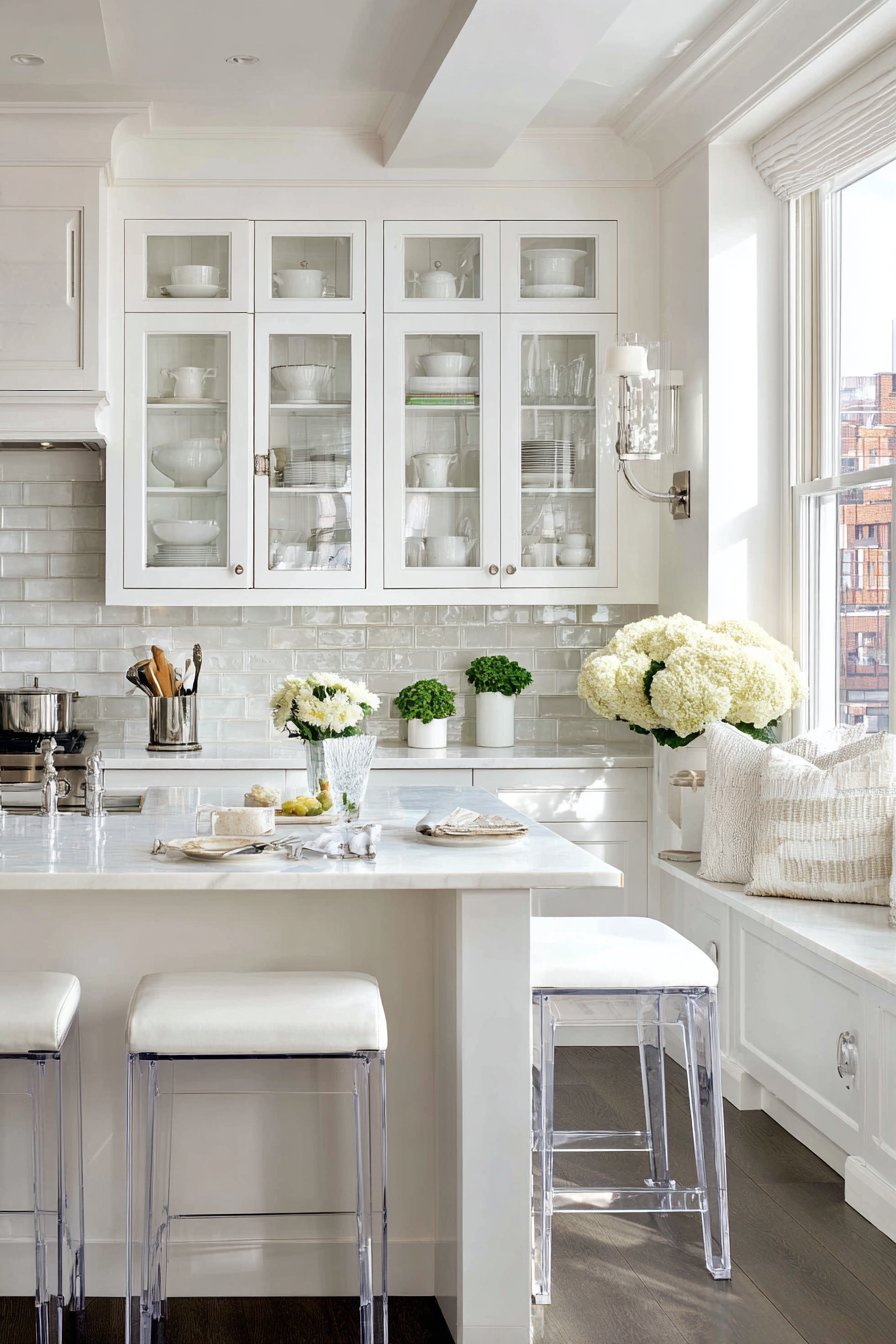 Glass and transparent materials are powerful tools for maintaining openness while providing necessary separation or storage. Glass-front cabinet doors allow you to see through to the wall behind, preventing the visual dead-end that solid doors create. This transparency makes the kitchen feel less enclosed while still providing dust protection for stored items.