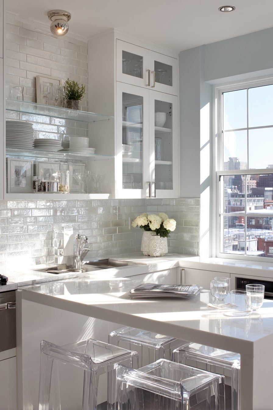 - Use glass tile backsplashes in light colors or clear finishes