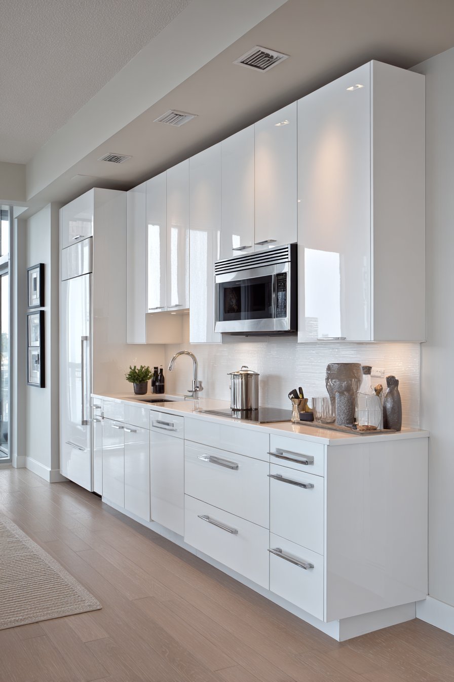 - Choose white or off-white cabinetry to maximize light reflection
