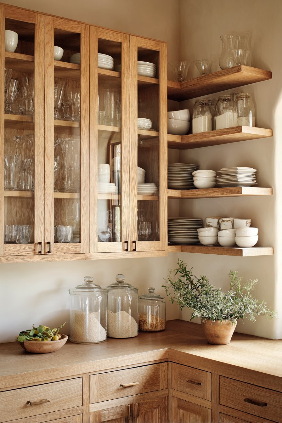 - Consider glass-front cabinets as a compromise between open and closed storage