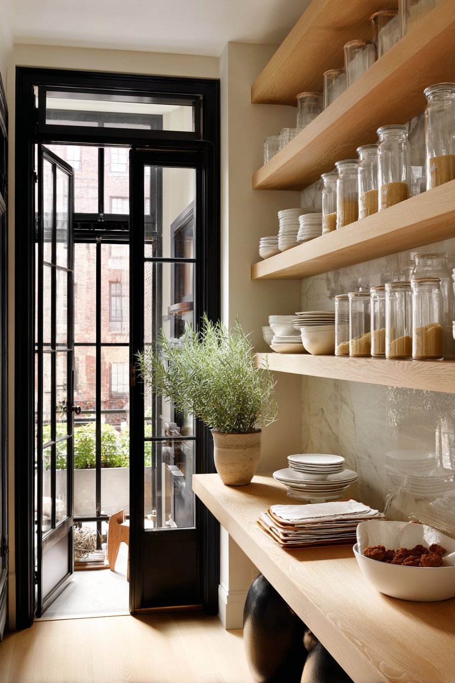 - Use glass containers on open shelves for visual consistency