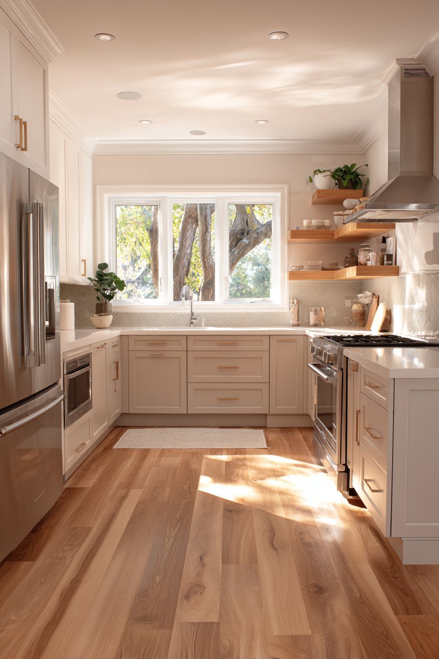 Consistent flooring that flows from kitchen into adjacent rooms eliminates visual boundaries that fragment space. When flooring changes, the eye registers a separation and confinement that makes the kitchen feel more isolated and smaller. Continuous flooring creates seamless transition that makes the entire area read as a single, more spacious whole.