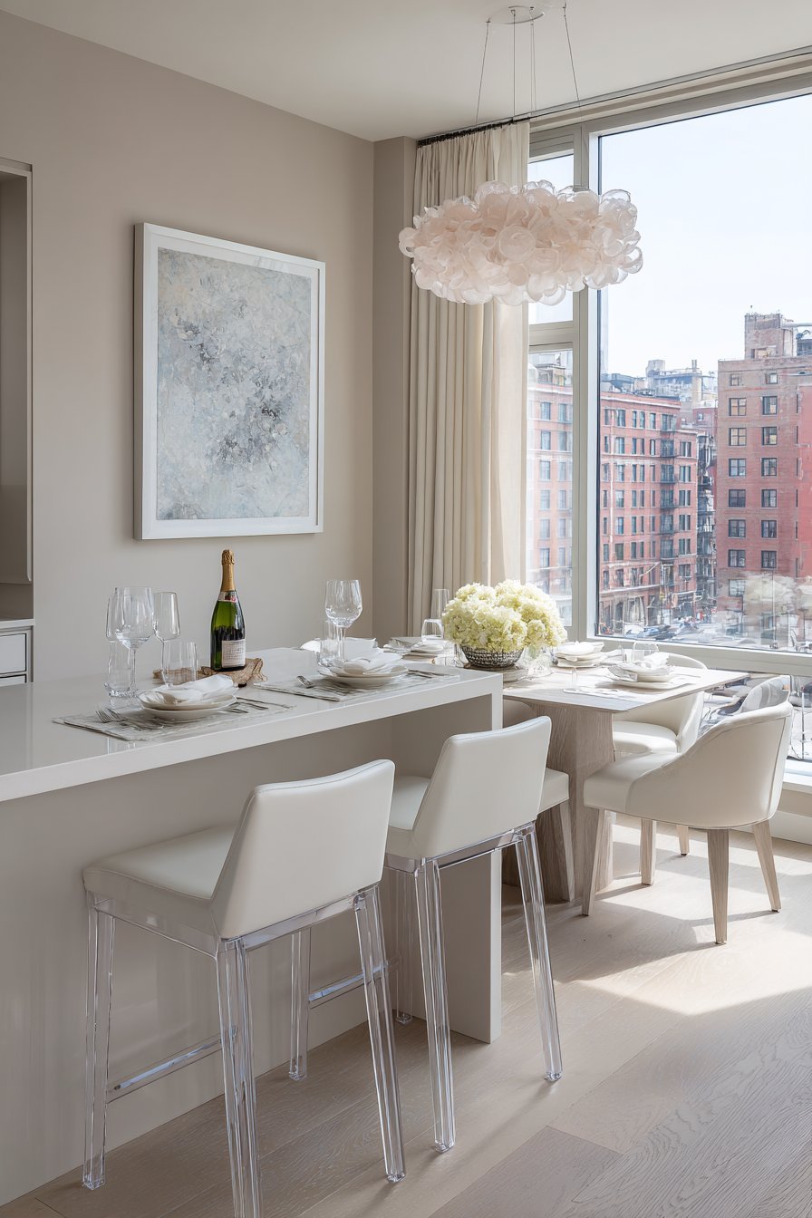 Transparent furniture elements like acrylic bar stools or glass dining tables maintain functionality without consuming visual space. These pieces seem to disappear, allowing the eye to travel through and beyond them rather than stopping at solid barriers. This principle is particularly valuable in eat-in kitchens where furniture can quickly make a small space feel crowded.