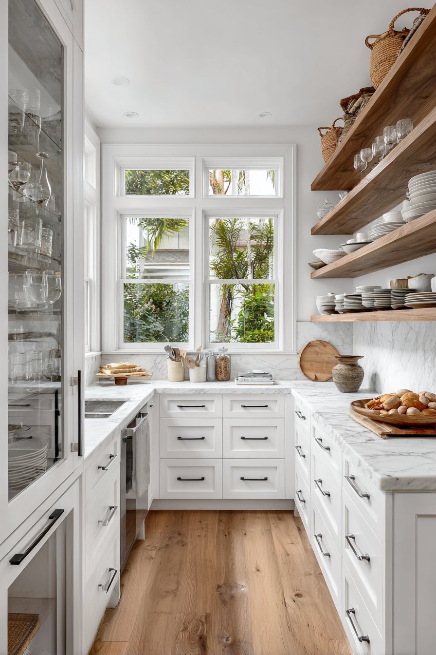 Floor-to-ceiling cabinetry maximizes storage capacity while drawing the eye upward, creating the illusion of height. This vertical emphasis makes ceilings appear taller and the overall space feel more expansive. Open shelving on upper walls provides accessible storage for frequently used items while maintaining an airy quality that closed cabinets cannot achieve.