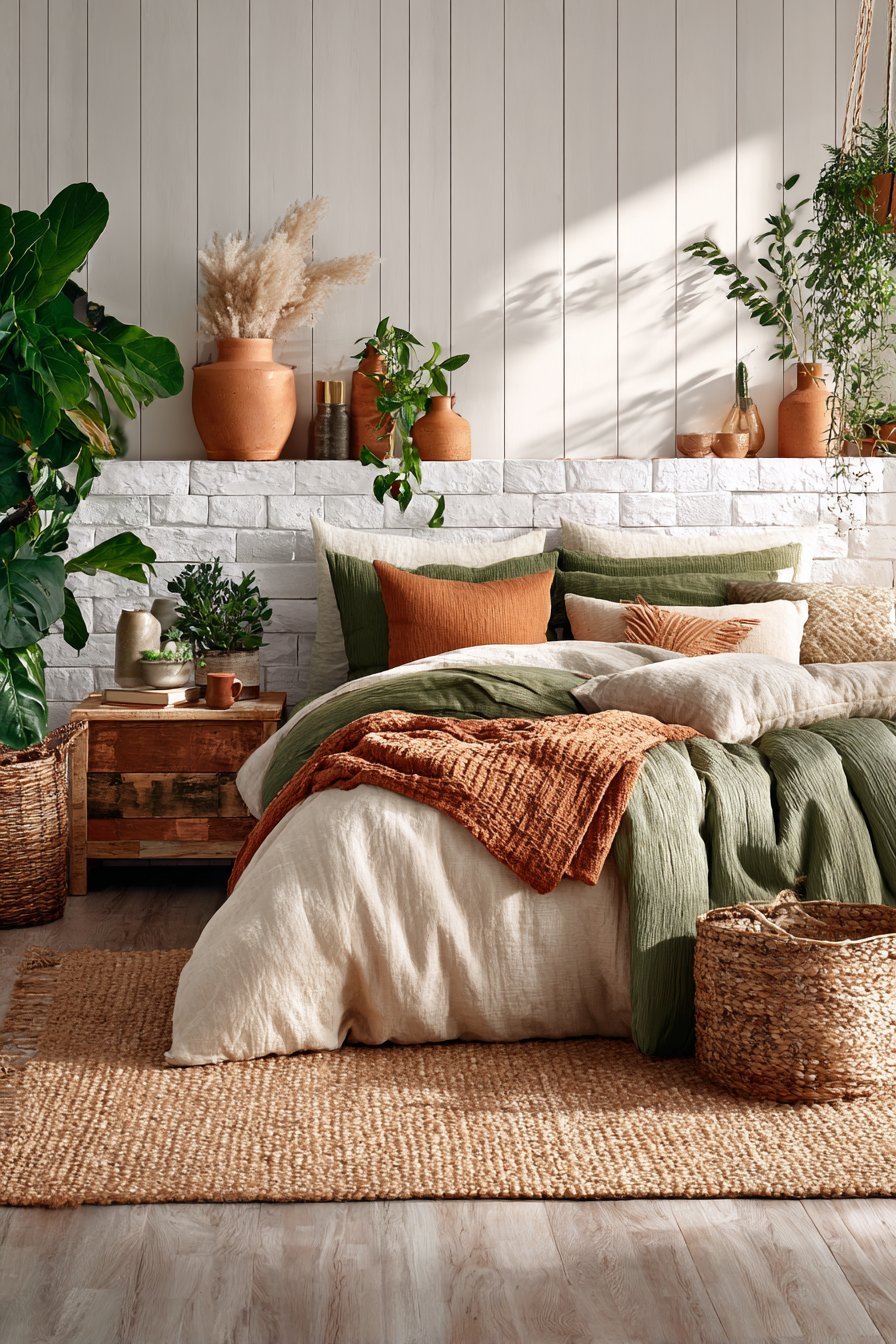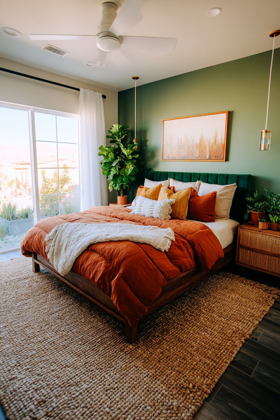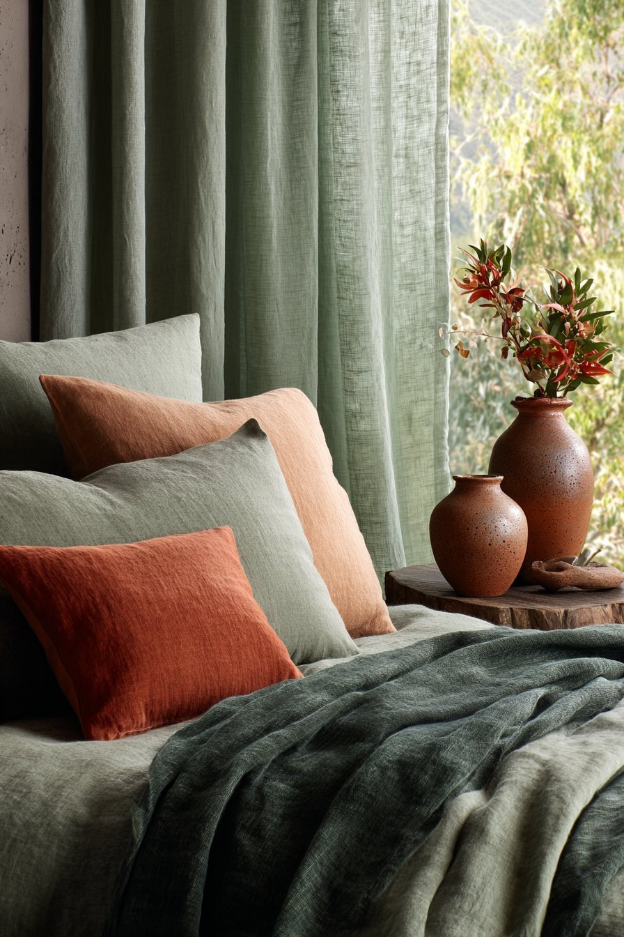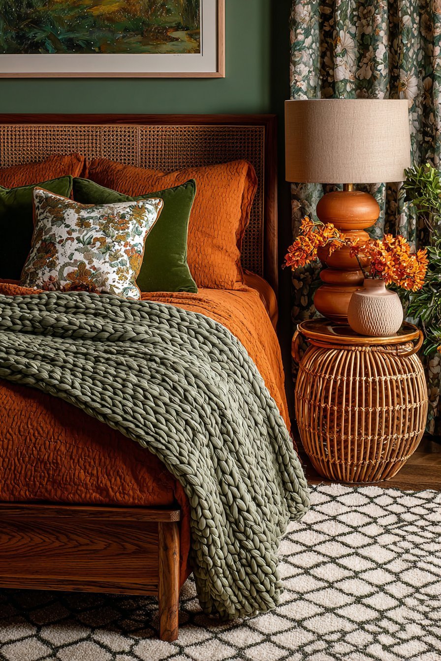 Texture layering adds dimensional interest that solid colors alone cannot achieve. Consider terracotta linen bedding topped with a chunky sage knit throw. Add velvet pillows in forest green alongside woven rattan accessories in natural terracotta tones. These textural variations create sophistication that elevates the entire space beyond simple color coordination.