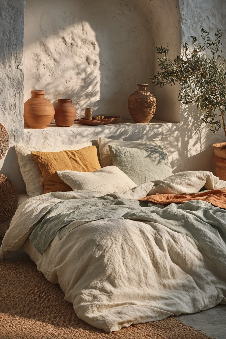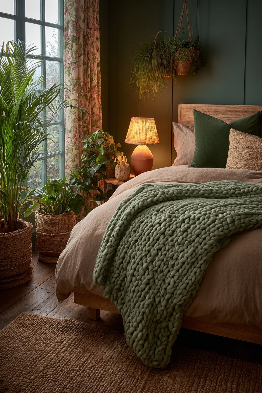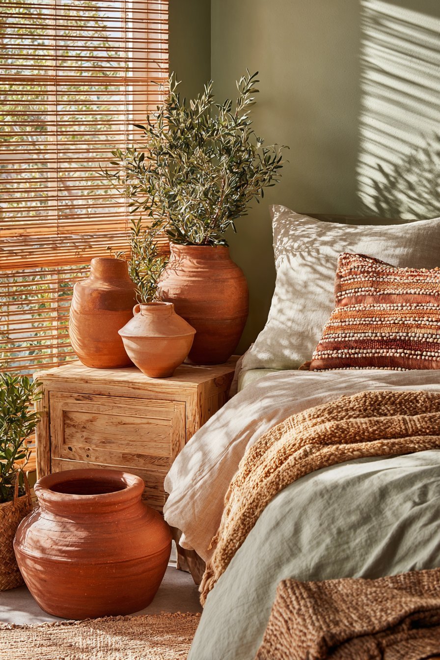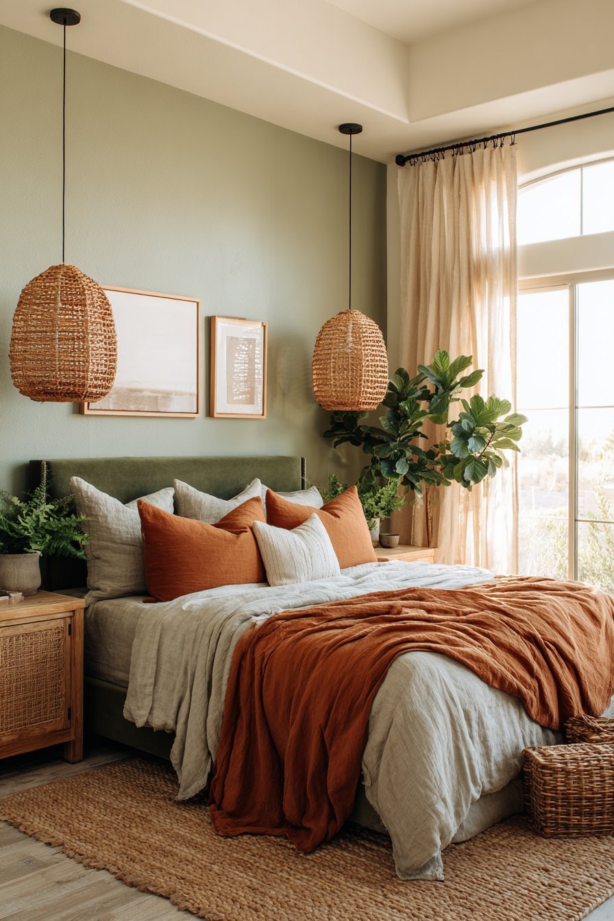 Texture layering adds dimensional interest that solid colors alone cannot achieve. Consider terracotta linen bedding topped with a chunky sage knit throw. Add velvet pillows in forest green alongside woven rattan accessories in natural terracotta tones. These textural variations create sophistication that elevates the entire space beyond simple color coordination.