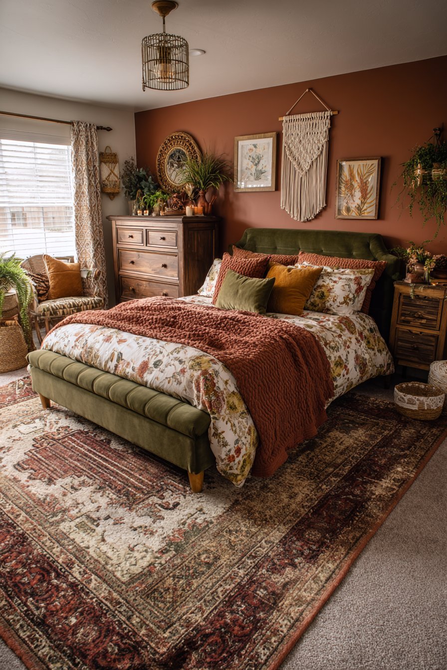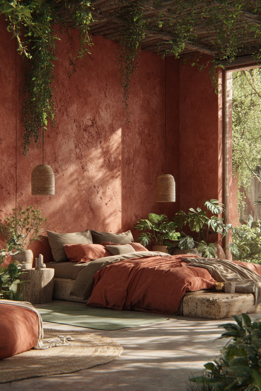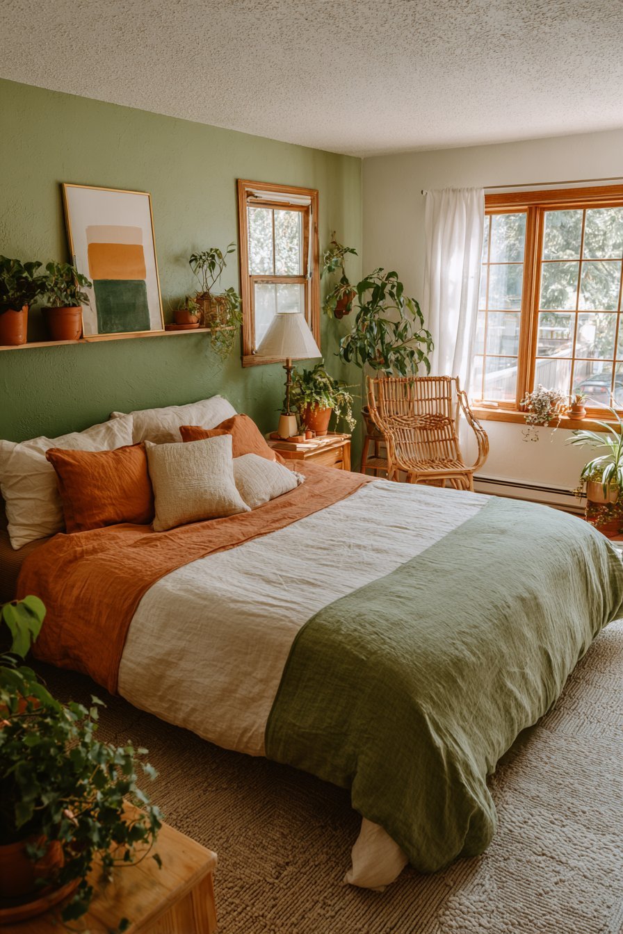 Successful bedroom design extends beyond flat color application into the realm of tactile and visual texture. Green and terracotta provide an ideal foundation for pattern mixing because their natural affinity prevents clashing. You can confidently combine florals, geometrics, stripes, and organic patterns when they share this color palette.