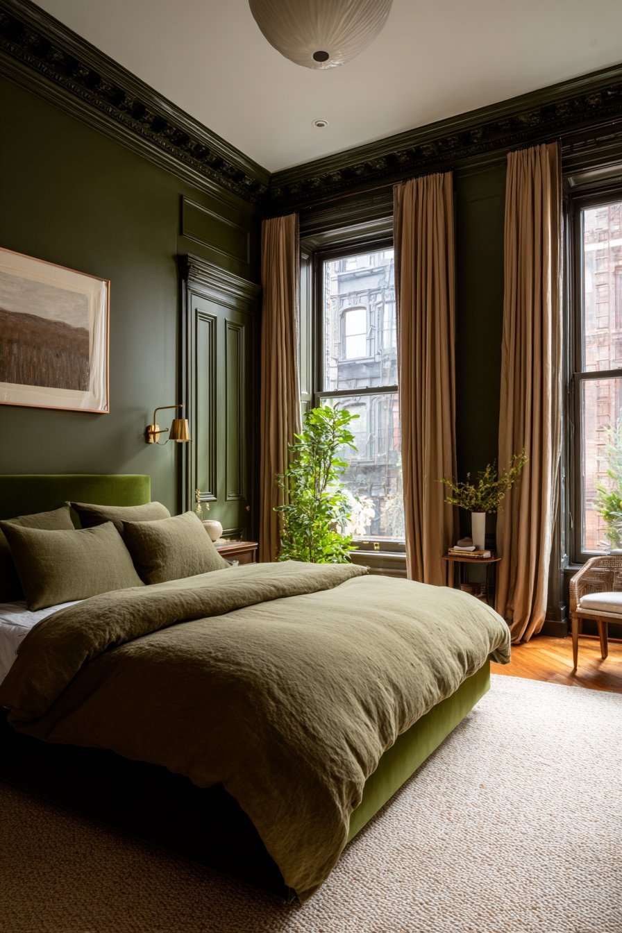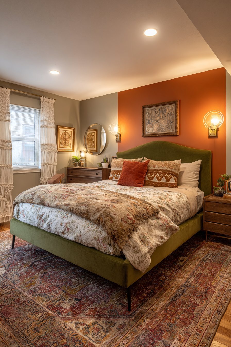 In bohemian spaces, these colors create the earthy backdrop that defines the style. Layer different green tones from sage to forest alongside terracotta textiles and ceramics. Mid-century modern bedrooms benefit from cleaner applications—think olive green upholstery paired with terracotta accent walls. Even traditional spaces embrace this pairing through darker hunter greens and refined terracotta accessories.