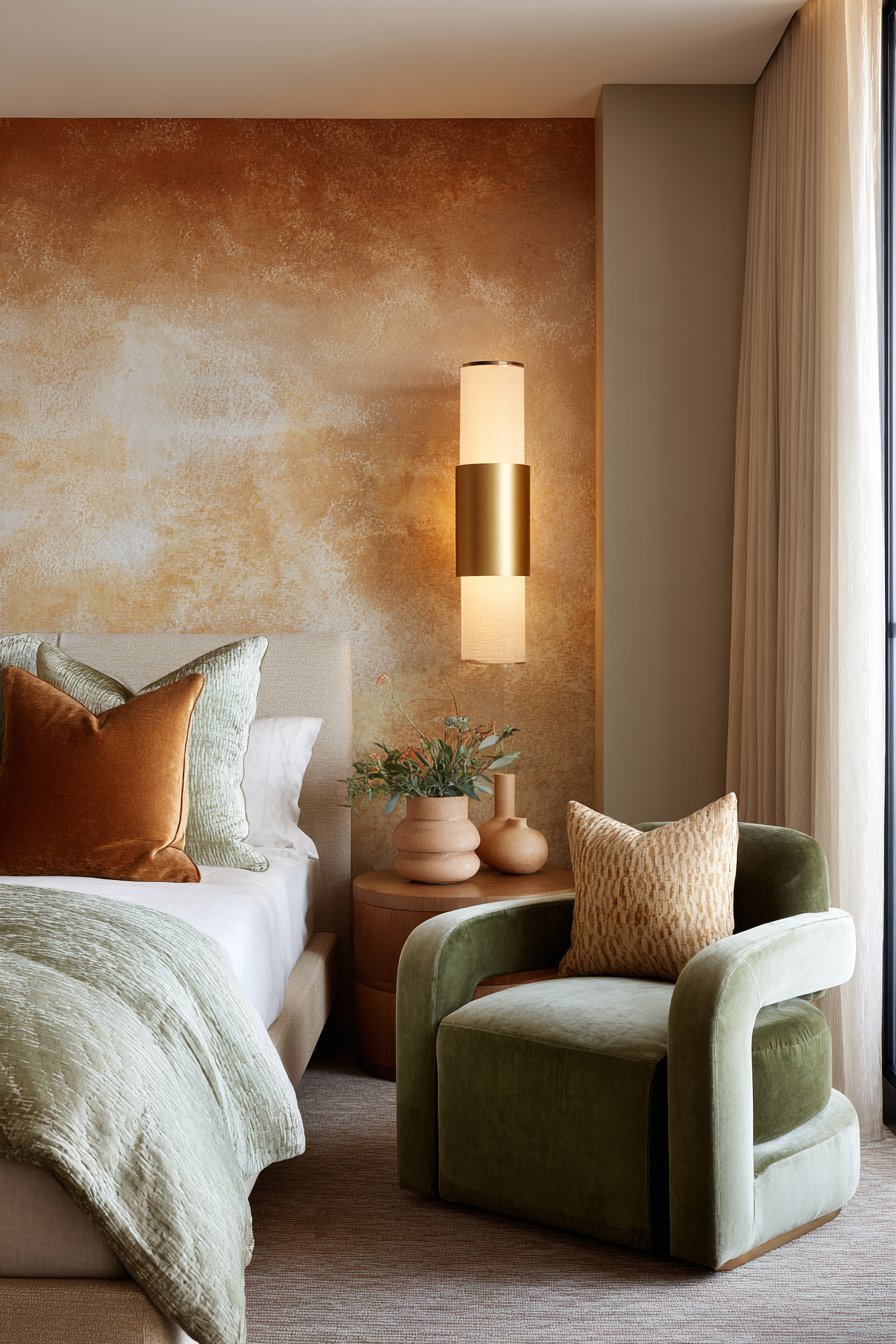 The earthy nature of both colors means they register as neutrals themselves in many applications. A terracotta linen duvet or sage velvet headboard doesn’t demand the same commitment as bright jewel tones. If you tire of the combination, these pieces transition easily into other color schemes without appearing dated or mismatched.