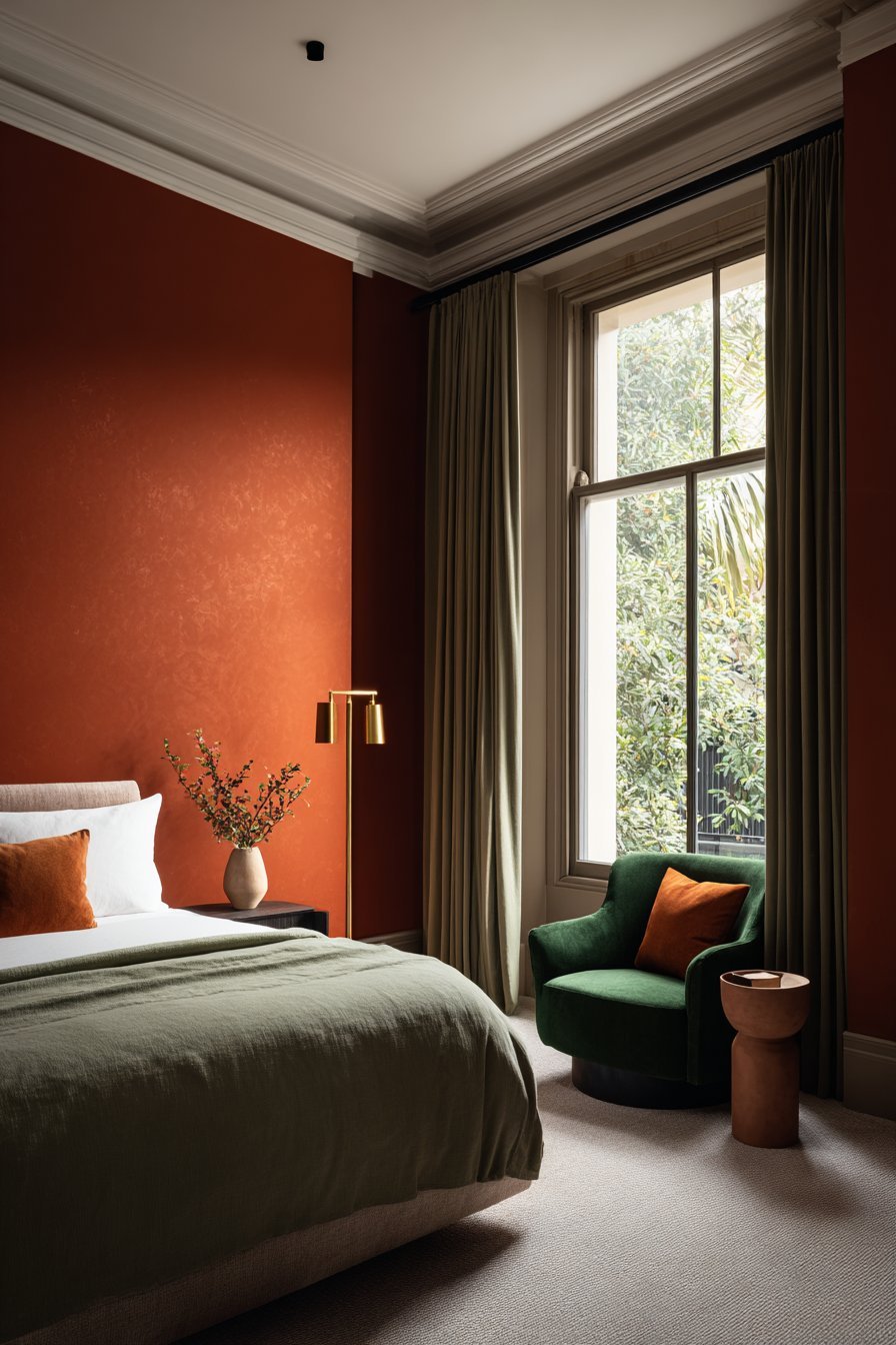 In north-facing bedrooms that receive limited natural light, terracotta walls can compensate for the cool dimness that often makes these spaces feel unwelcoming. Conversely, south-facing rooms flooded with warm afternoon light benefit from green’s cooling influence. The interplay between these colors creates consistent comfort regardless of external lighting conditions.
