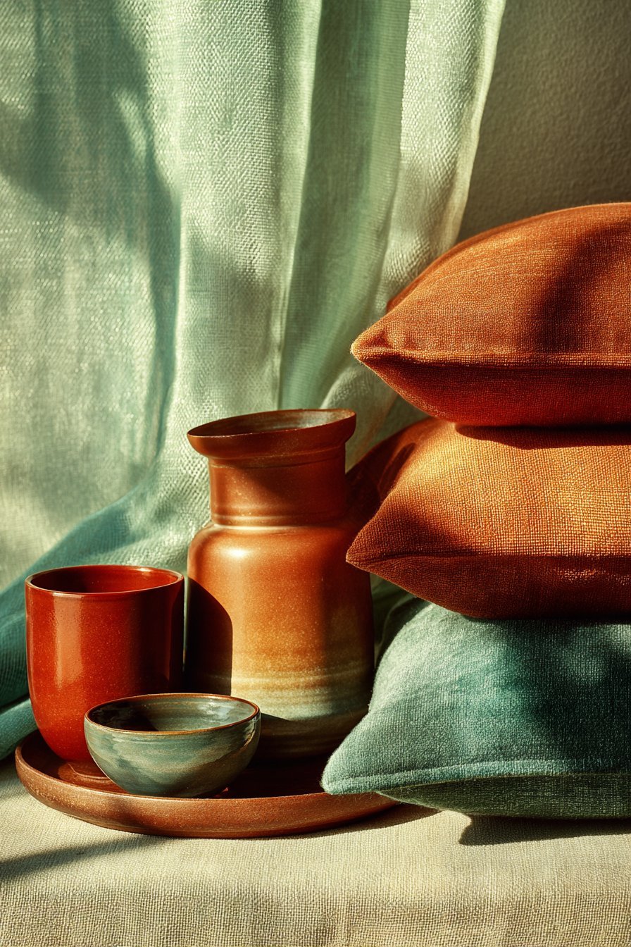 - Layer various terracotta tones through textiles and accessories
