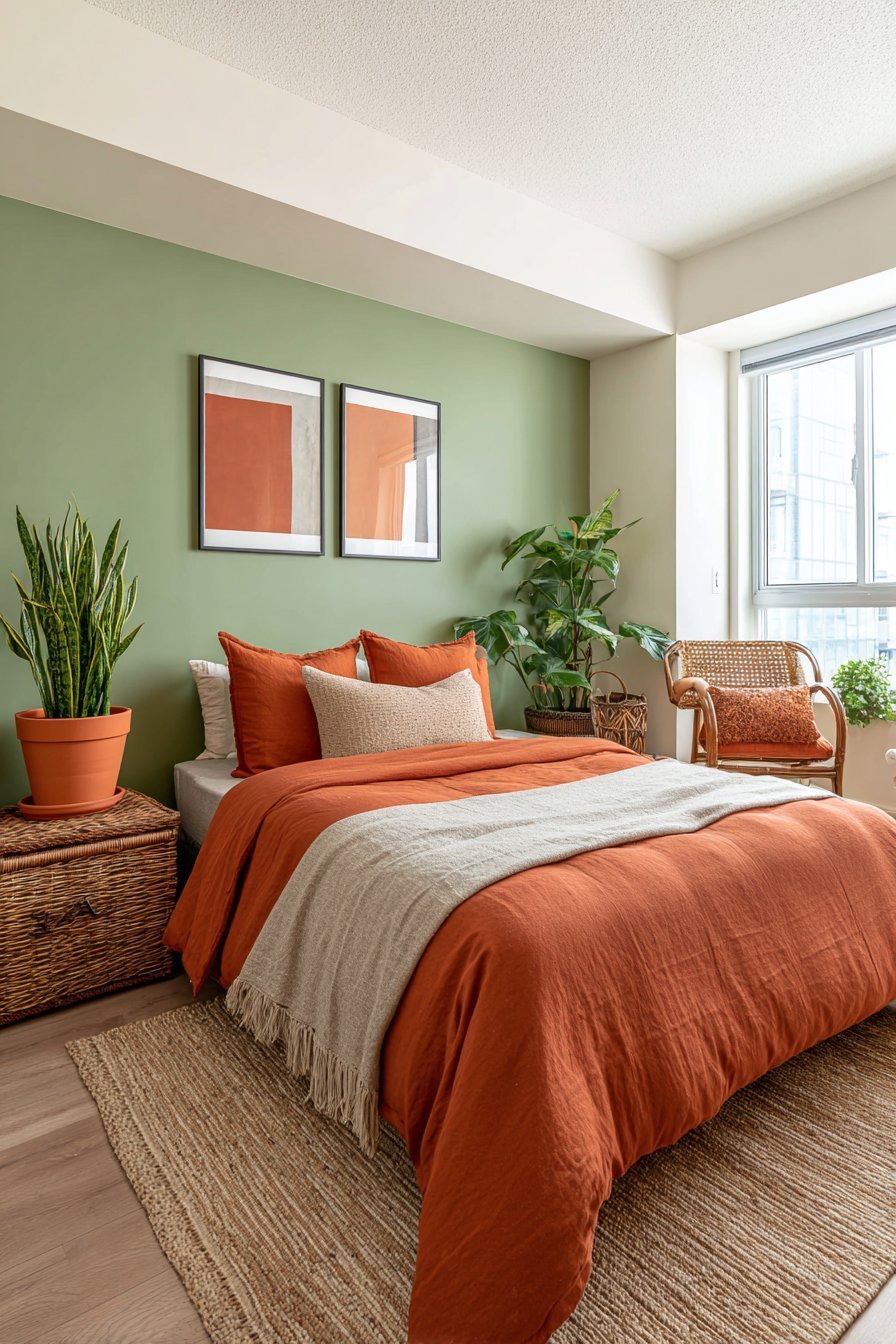 Lighter interpretations create airy, refreshing spaces perfect for small bedrooms or those seeking Scandinavian simplicity. Pale sage walls paired with soft terracotta accents maintain openness while adding character. Darker versions—forest green with burnt terracotta—deliver drama and sophistication suited to larger bedrooms or those desiring bold statements.