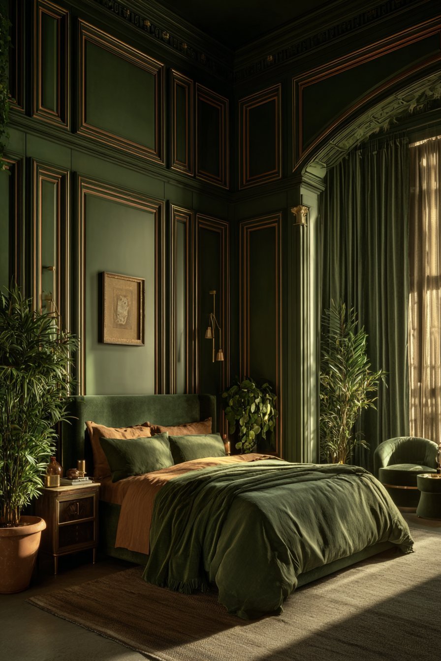 - Balance hunter green with soft terracotta clay for masculine elegance
