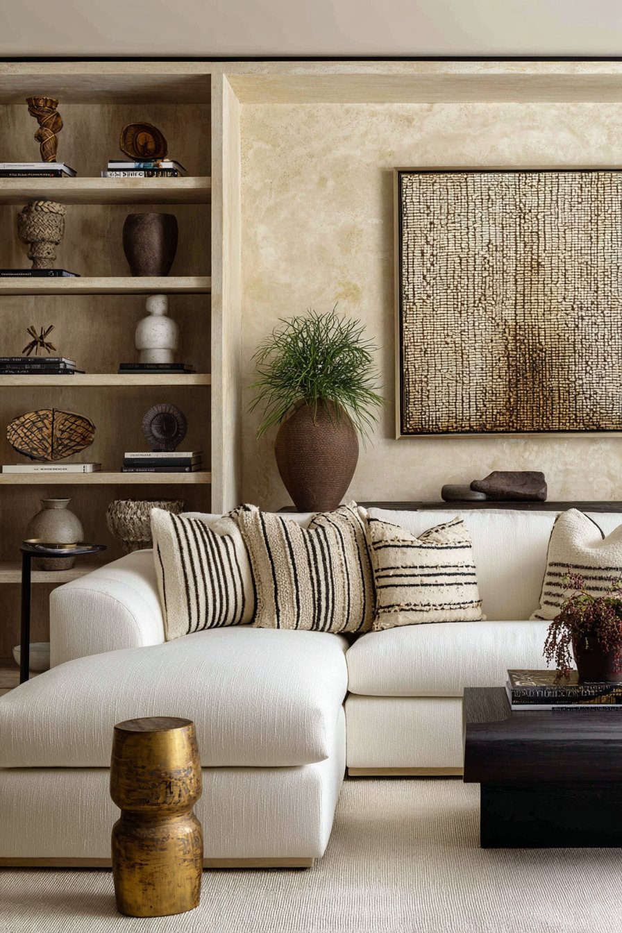 - Mix flat artwork with three-dimensional elements — ceramics, sculptures, woven pieces — for visual depth