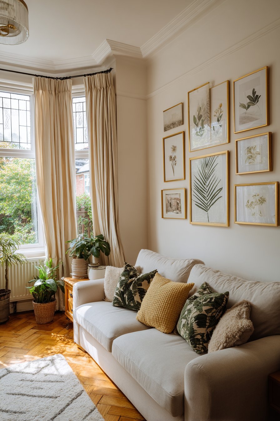 - Choose a consistent frame finish — all brass, all black, all timber — for all primary gallery wall pieces